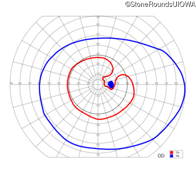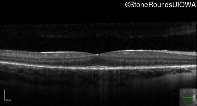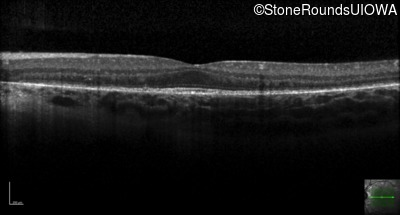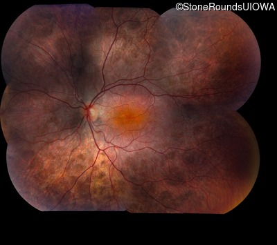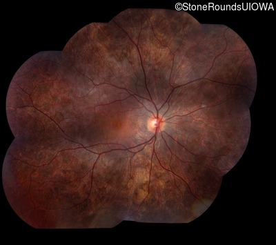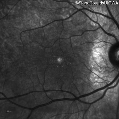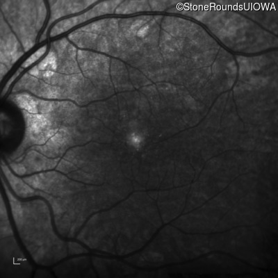 This 11 year old boy first had some fundus abnormalities noted during a routine eye exam at age 8. He remains asymptomatic. He has no difficulties seeing in dim light.
