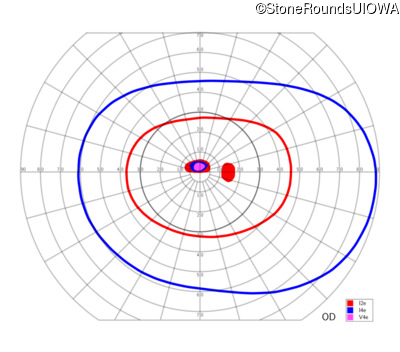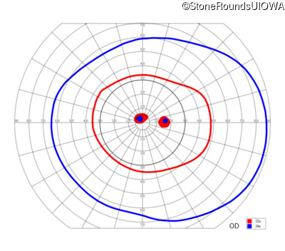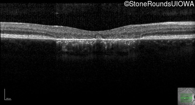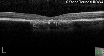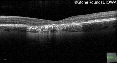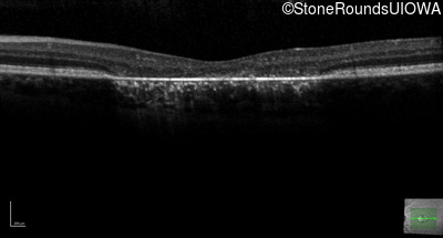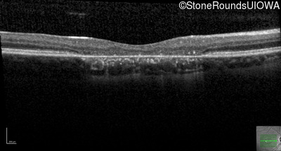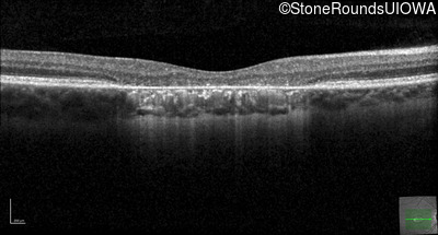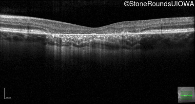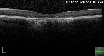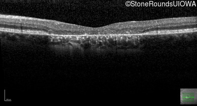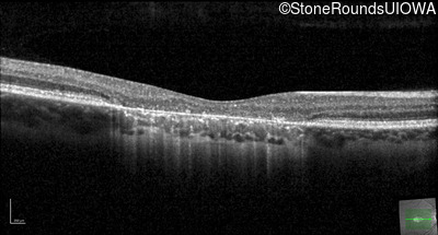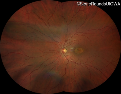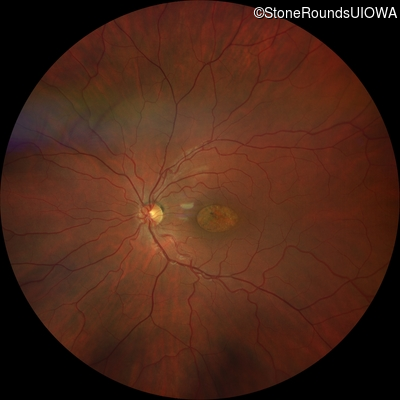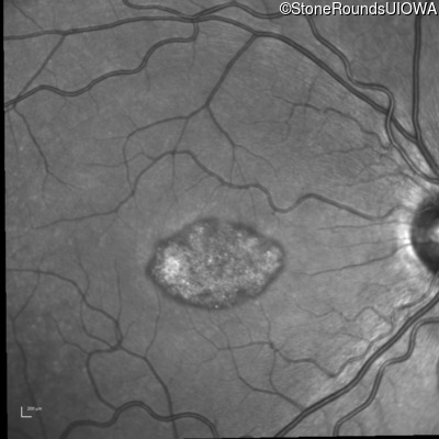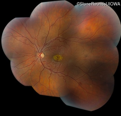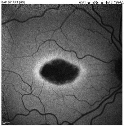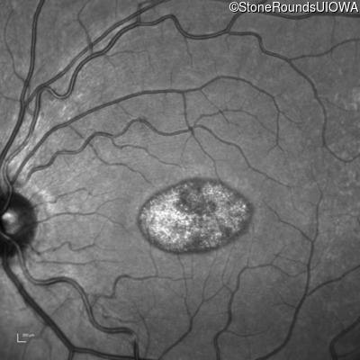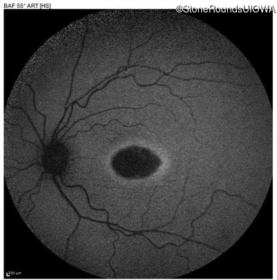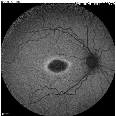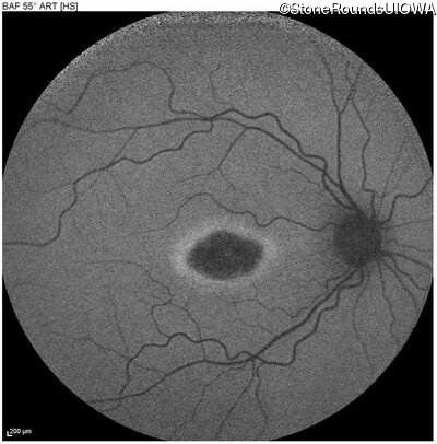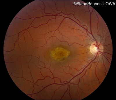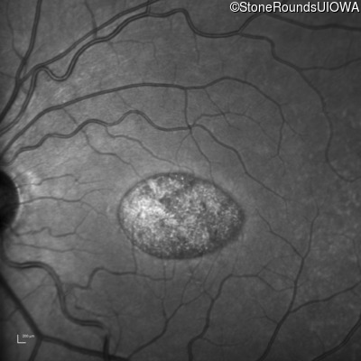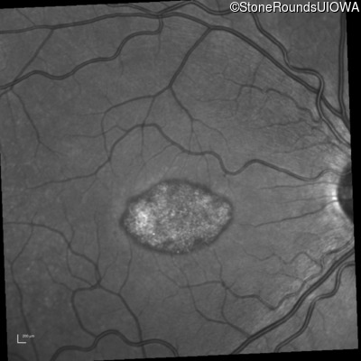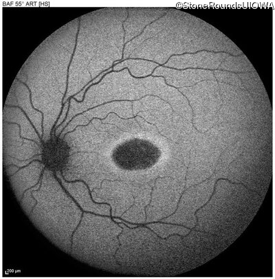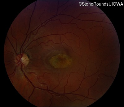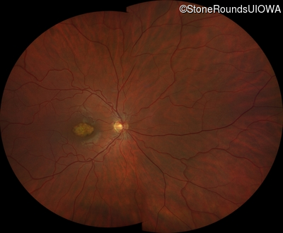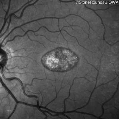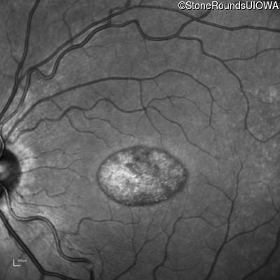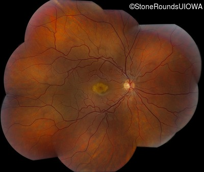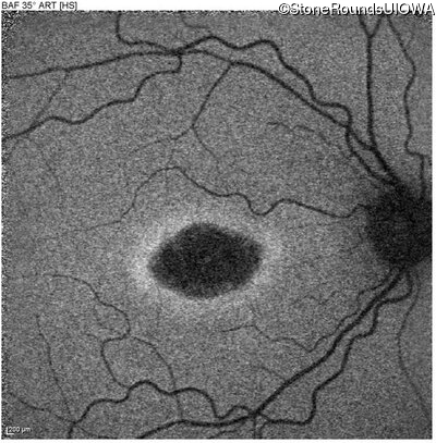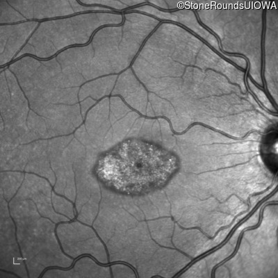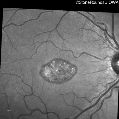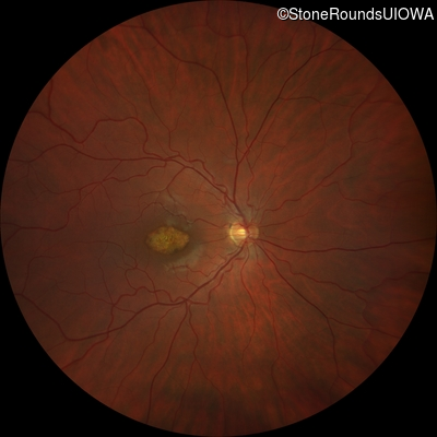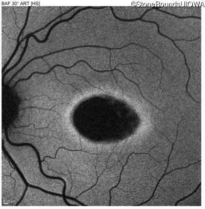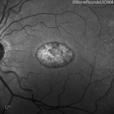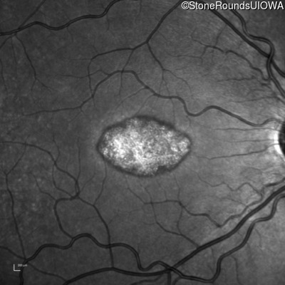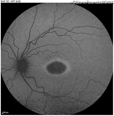 This 22 year old man had macular abnormalities noted incidentally at a routine eye exam at age 19. Since then, he has experienced a gradual loss of acuity particularly in the left eye.