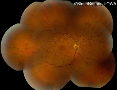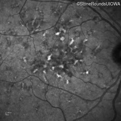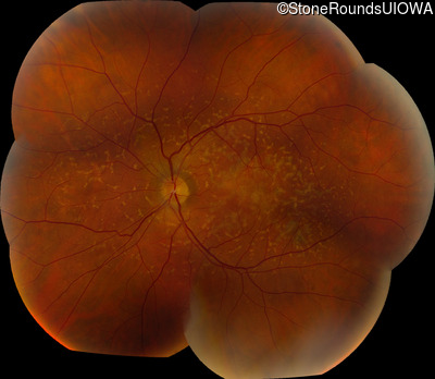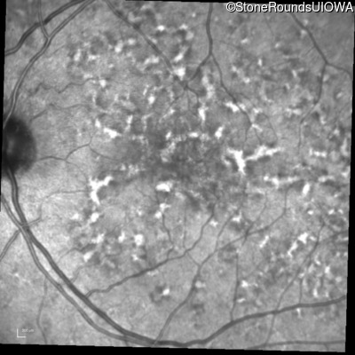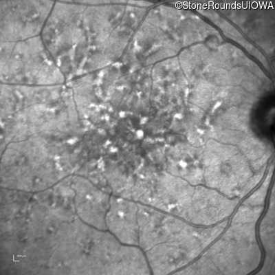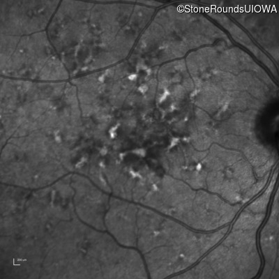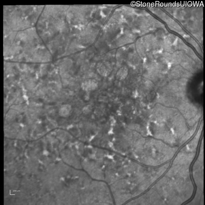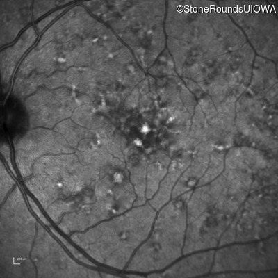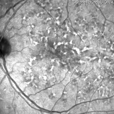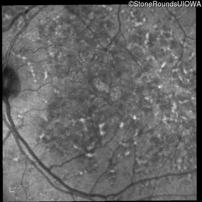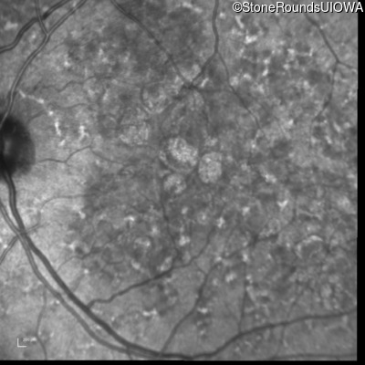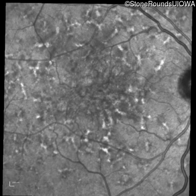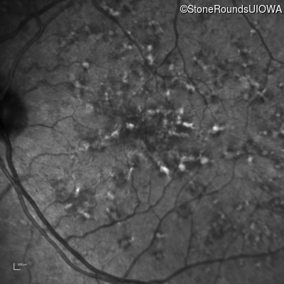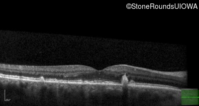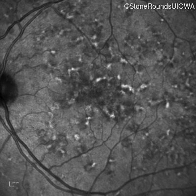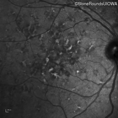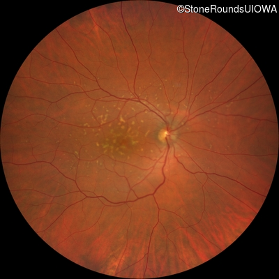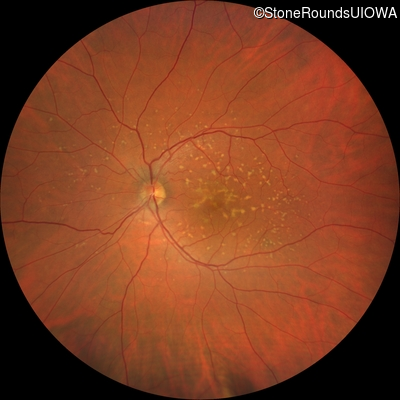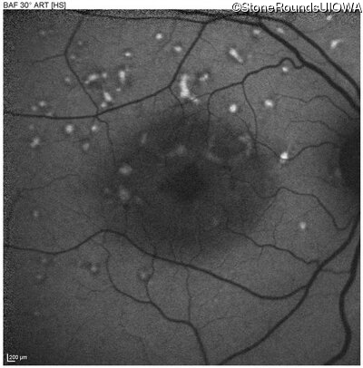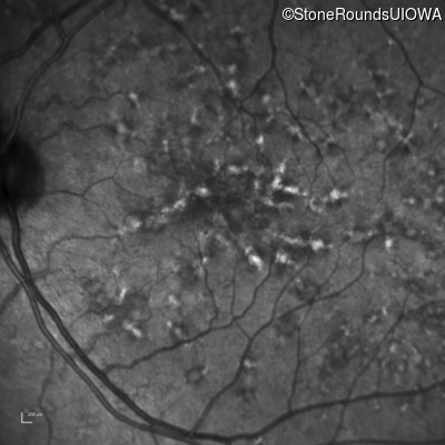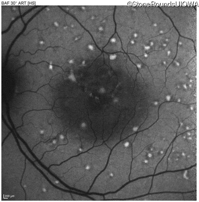 This 49 year old man was first told he had a fundus abnormality on a routine eye exam at age 34. Ten years later he noticed some distortion just superior to fixation.