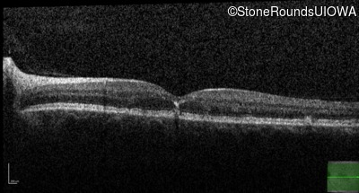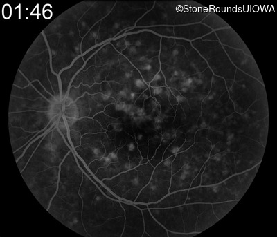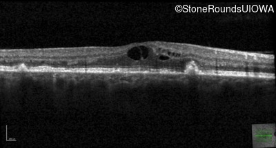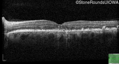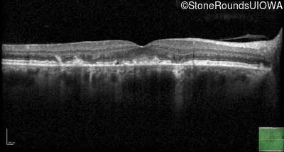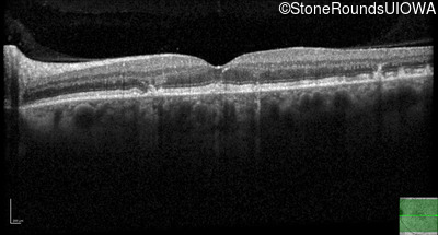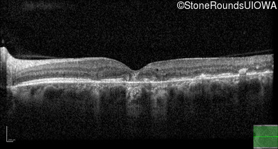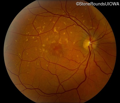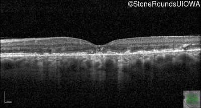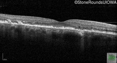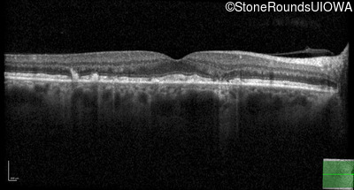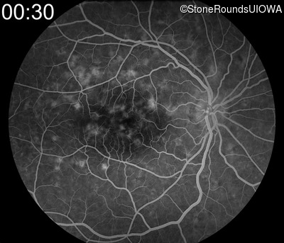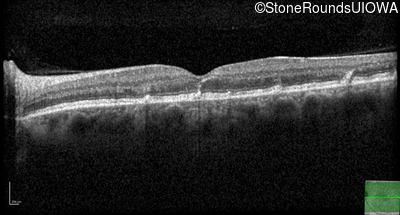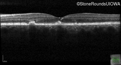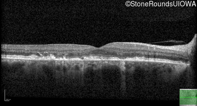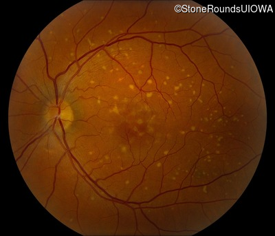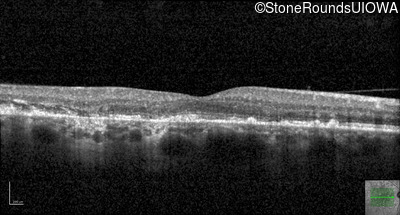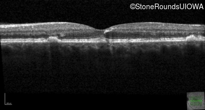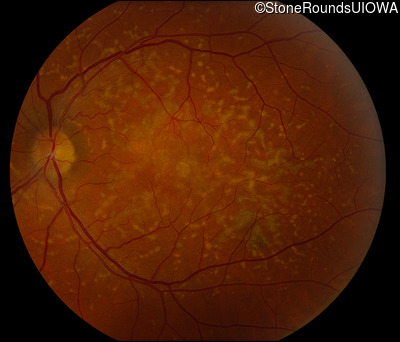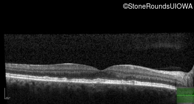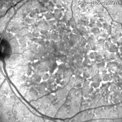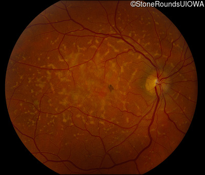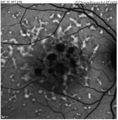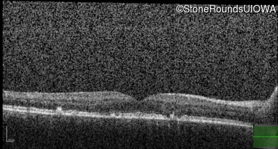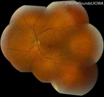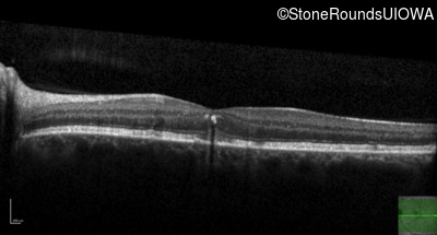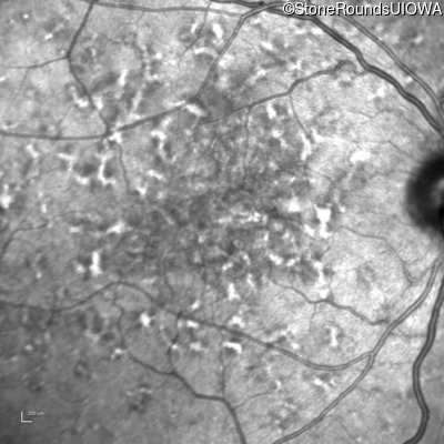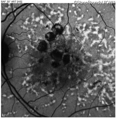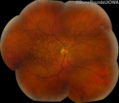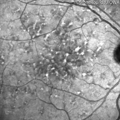 This 49 year old man was first told he had a fundus abnormality on a routine eye exam at age 34. Ten years later he noticed some distortion just superior to fixation.