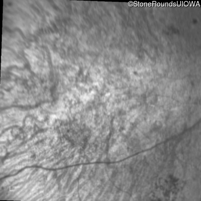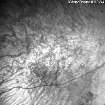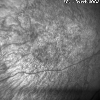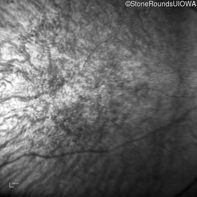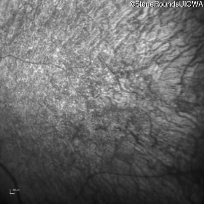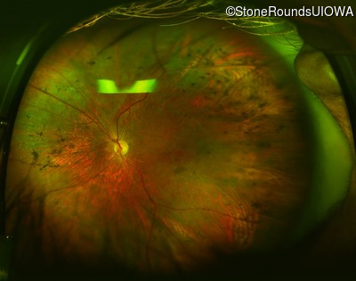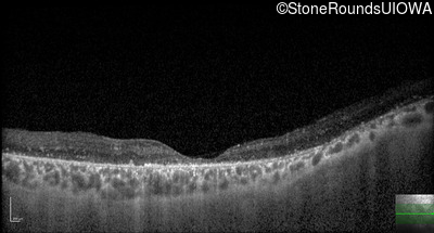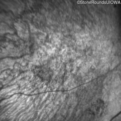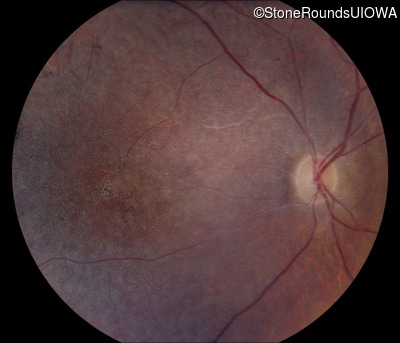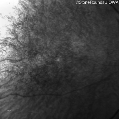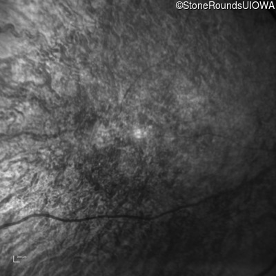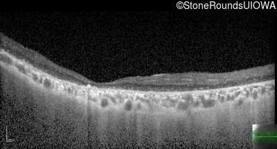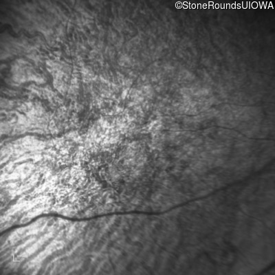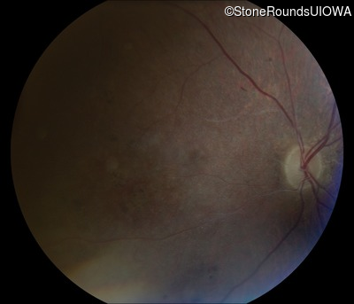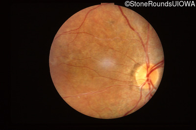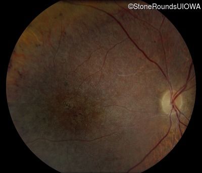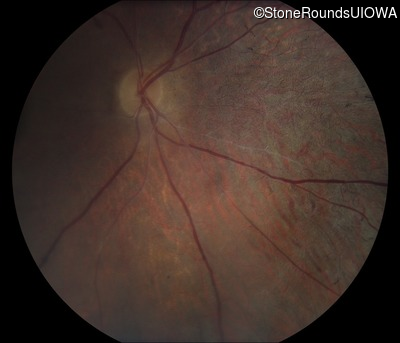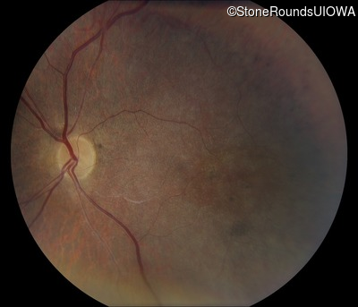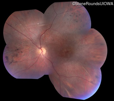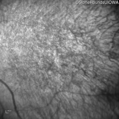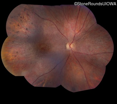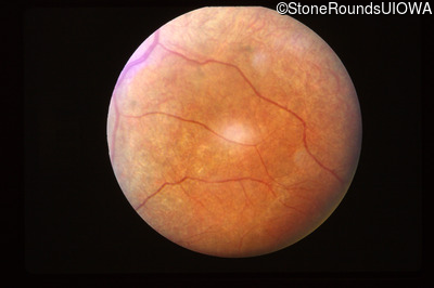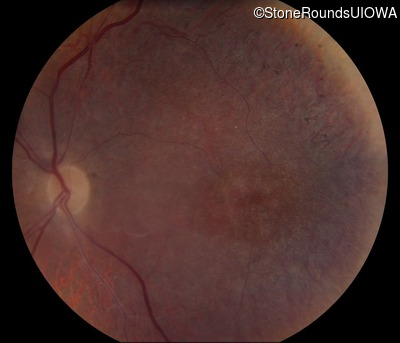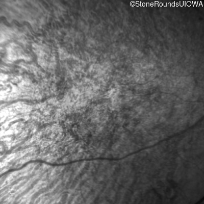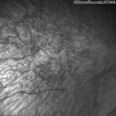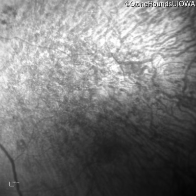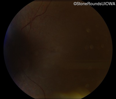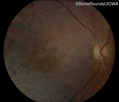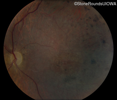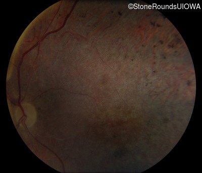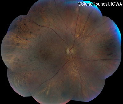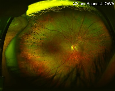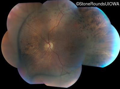 This 41 year old man first came to medical attention at age 18 months when exotropia and amblyopia of his right eye were discovered. At age 11 vitreous strands and retinal vascular sheathing were seen. He has had poor night vision and constricted visual fields since his late teens. Later, at age 44 a traction retinal detachment was noted in his left eye and was treated with a scleral buckle.