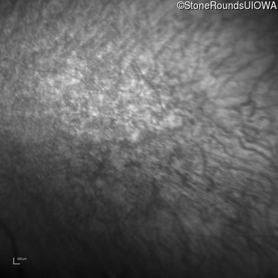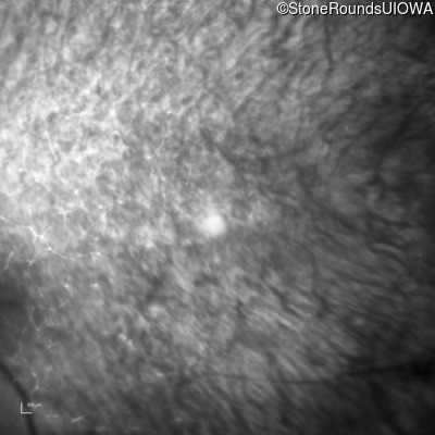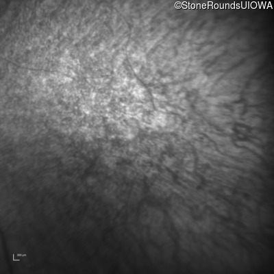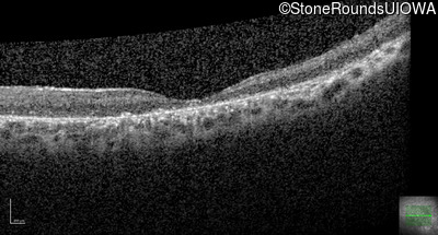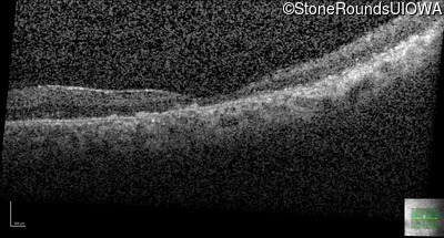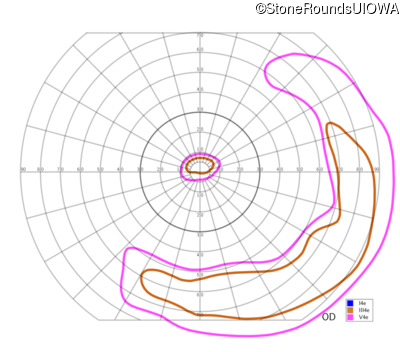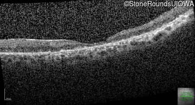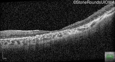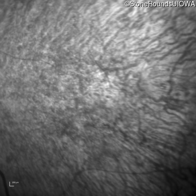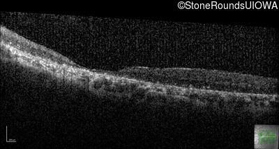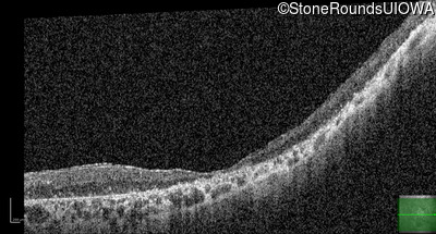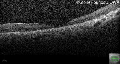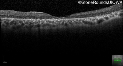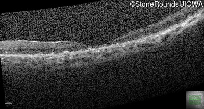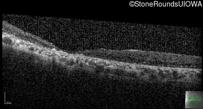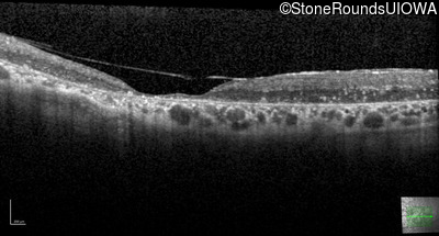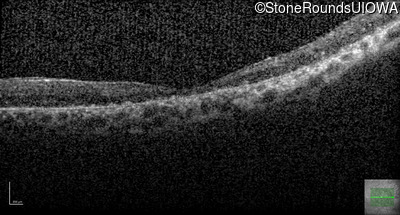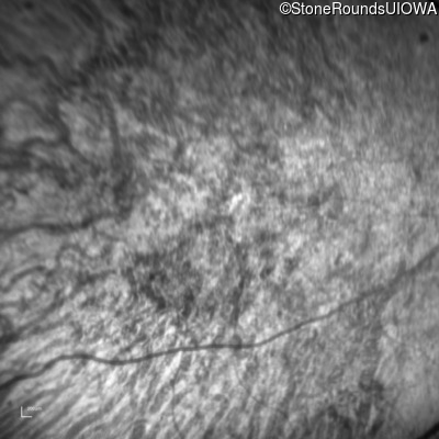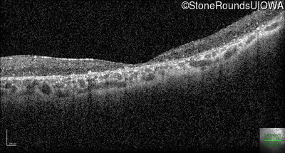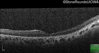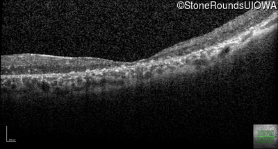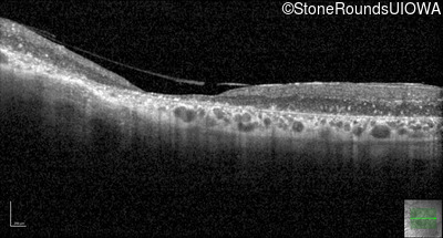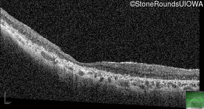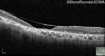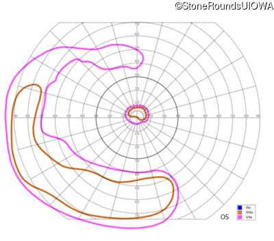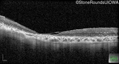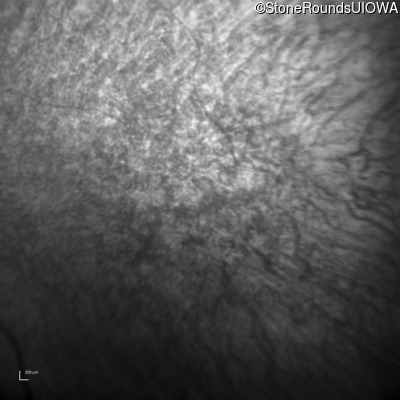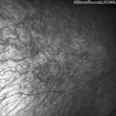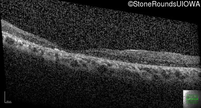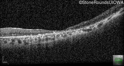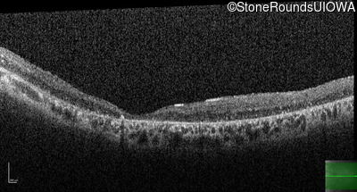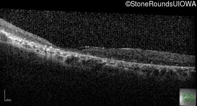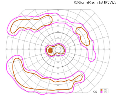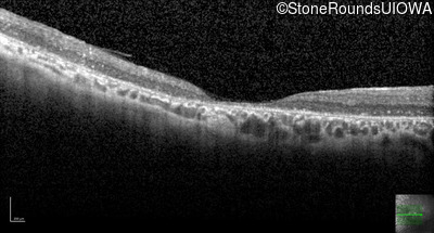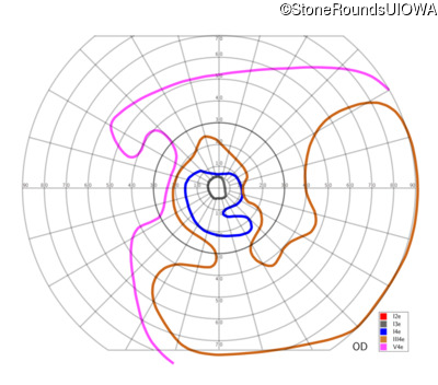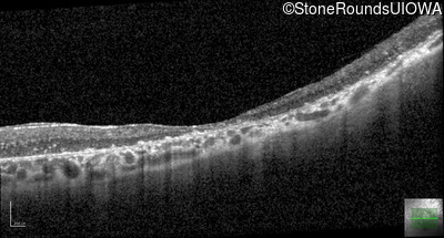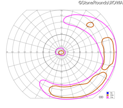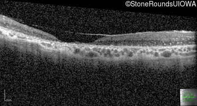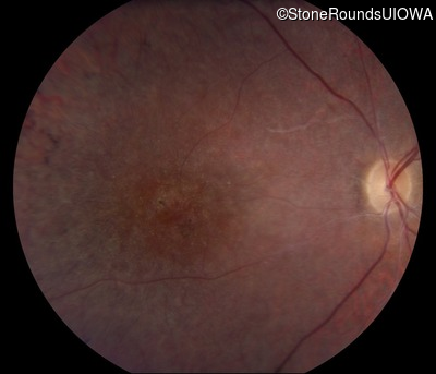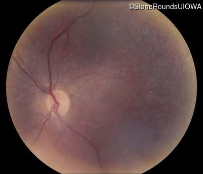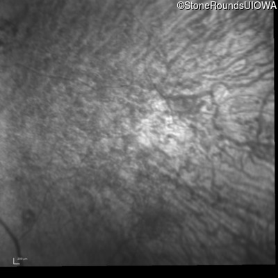 This 41 year old man first came to medical attention at age 18 months when exotropia and amblyopia of his right eye were discovered. At age 11 vitreous strands and retinal vascular sheathing were seen. He has had poor night vision and constricted visual fields since his late teens. Later, at age 44 a traction retinal detachment was noted in his left eye and was treated with a scleral buckle.