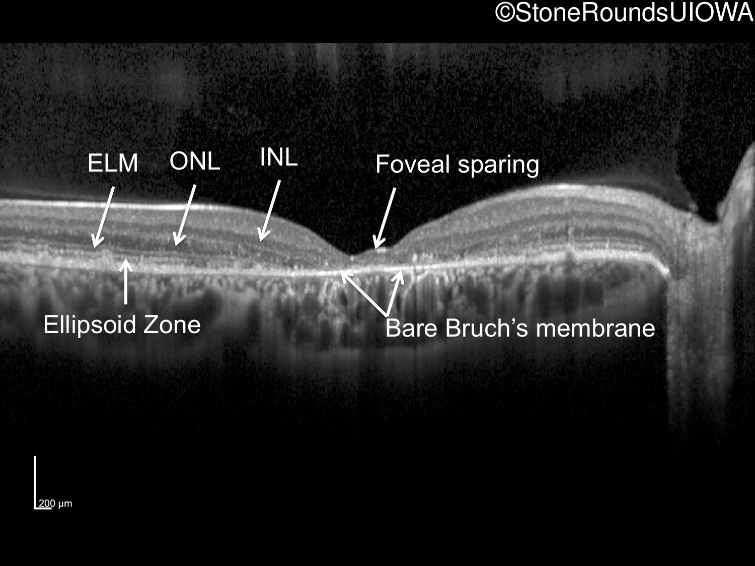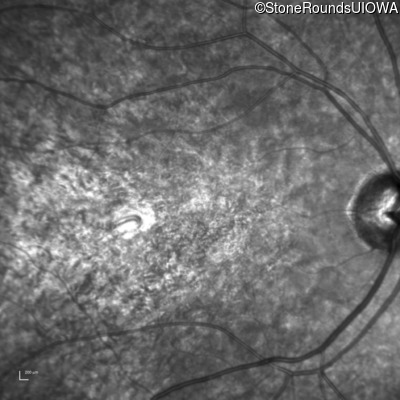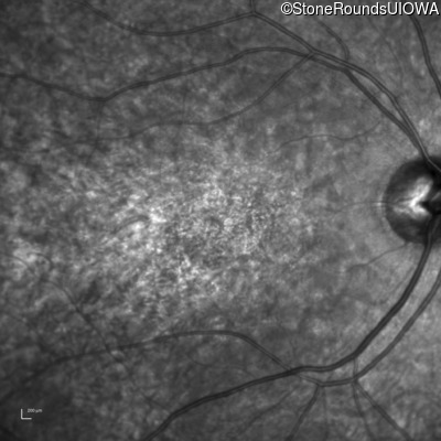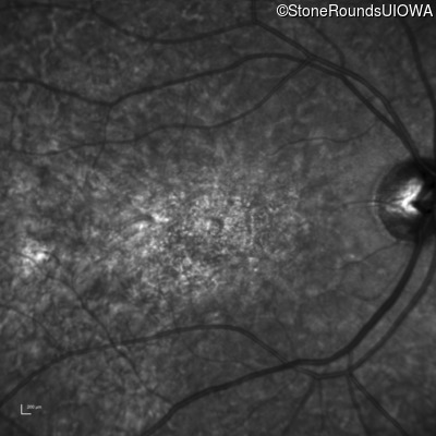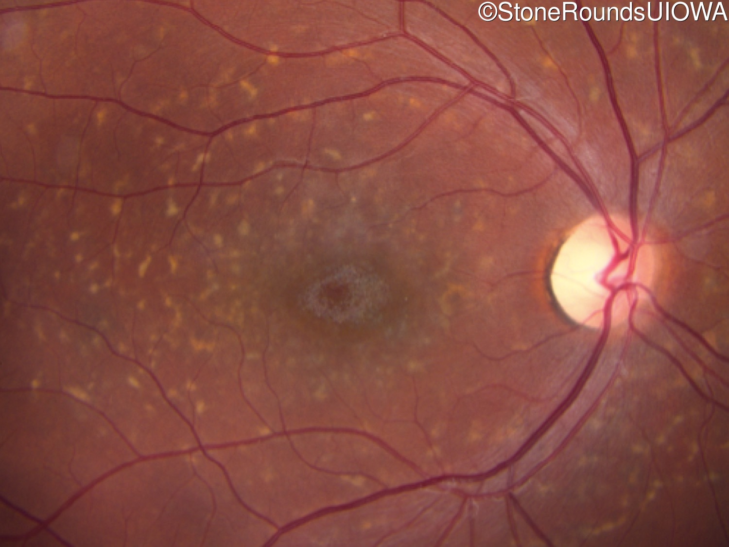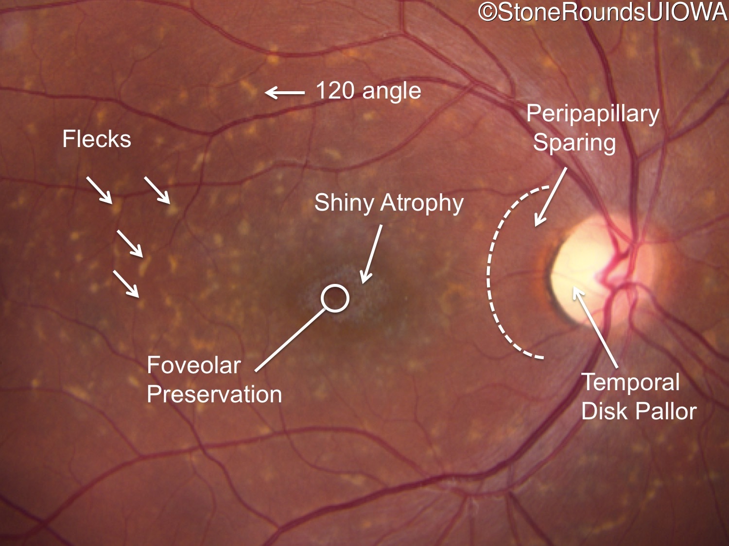 All three of the cardinal ophthalmic features of Mendelian macular dystrophies are present in this patient. The most striking features of the fundus exam are the numerous yellow flecks at the level of the RPE. Flecks are most commonly seen in AR Stargardt disease and pattern dystrophy although they may be seen in some of the rarer Mendelian maculopathies as well. The visual acuity in patients with AR Stargardt disease is often "worse than the fundus looks" while the acuity in pattern dystrophy is often quite good despite extensive flecks. The pedigree of this patient is compatible with ABCA4-associated Stargardt disease and the better than expected acuity is attributable to foveal sparing (see below). The onset of reduced acuity at age 10 is much more characteristic of ABCA4 disease than pattern dystrophy. Another feature present in this patient that is very frequently seen in Stargardt disease is peripapillary sparing. However, this sign can be seen in pattern dystrophy as well. When central atrophy is present in ABCA4-associated Stargardt disease it often somewhat shiny (which is uncommon with the geographic atrophy of pattern dystrophy or age-related macular degeneration). Some patients with ABCA4-associated Stargardt disease can have some preservation of the fovea giving a zonal "bullseye" appearance to the center of the macula. Sometimes this preservation is associated with preserved acuity as in this case. The outer nuclear layer (ONL) is much thinner than normal on OCT, indicative of photoreceptor loss. This is associated with a thinning of the ellipsoid zone which is usually many times brighter and thicker than the external limiting membrane (ELM). These two lines are essentially equal in intensity in this patient. The foveal sparing is seen on OCT only as a small bit of retinal convexity in the center of the atrophy coupled with a small bit of residual RPE flanked by bare Bruch's membrane. The presence of a robust I2e isopter on Goldmann perimetry places this patient in the least severe half of all Stargardt patients (see Schindler, et al., 2010). Most patients with ABCA4-associated disease are somewhat myopic as is this patient. Stargardt patients also tend to perform very poorly on pseudoisochromatic plates, even when their acuity is still fairly good as it is here.