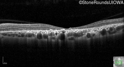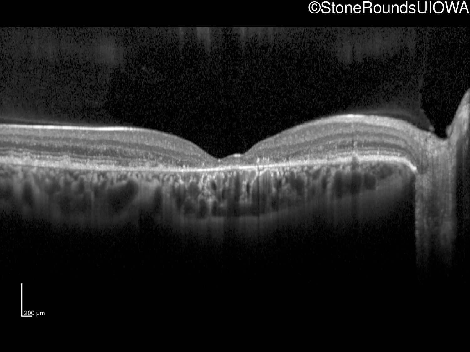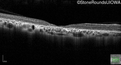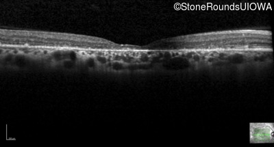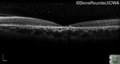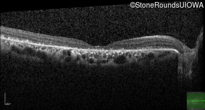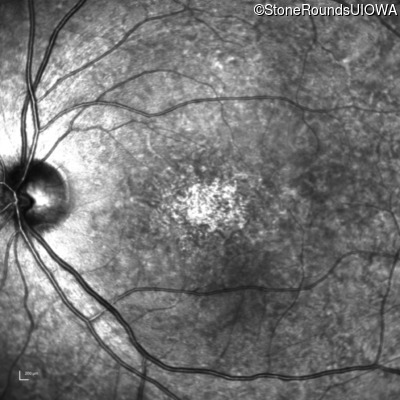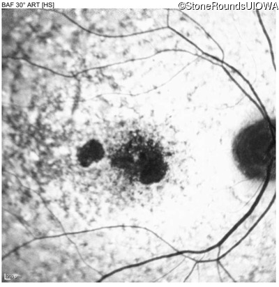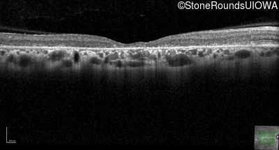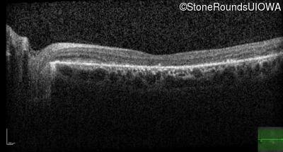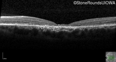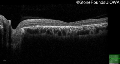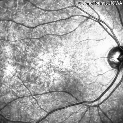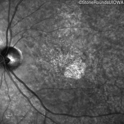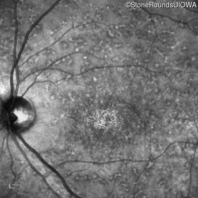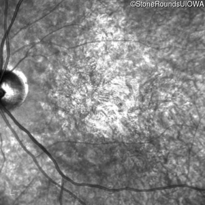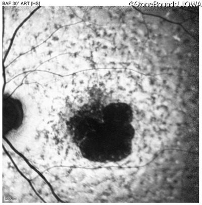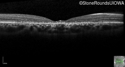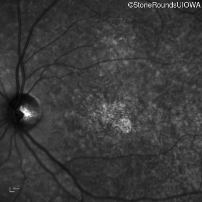 All three of the cardinal ophthalmic features of Mendelian macular dystrophies are present in this patient. The most striking features of the fundus exam are the numerous yellow flecks at the level of the RPE. Flecks are most commonly seen in AR Stargardt disease and pattern dystrophy although they may be seen in some of the rarer Mendelian maculopathies as well. The visual acuity in patients with AR Stargardt disease is often "worse than the fundus looks" while the acuity in pattern dystrophy is often quite good despite extensive flecks. The pedigree of this patient is compatible with ABCA4-associated Stargardt disease and the better than expected acuity is attributable to foveal sparing (see below). The onset of reduced acuity at age 10 is much more characteristic of ABCA4 disease than pattern dystrophy. Another feature present in this patient that is very frequently seen in Stargardt disease is peripapillary sparing. However, this sign can be seen in pattern dystrophy as well. When central atrophy is present in ABCA4-associated Stargardt disease it often somewhat shiny (which is uncommon with the geographic atrophy of pattern dystrophy or age-related macular degeneration). Some patients with ABCA4-associated Stargardt disease can have some preservation of the fovea giving a zonal "bullseye" appearance to the center of the macula. Sometimes this preservation is associated with preserved acuity as in this case. The outer nuclear layer (ONL) is much thinner than normal on OCT, indicative of photoreceptor loss. This is associated with a thinning of the ellipsoid zone which is usually many times brighter and thicker than the external limiting membrane (ELM). These two lines are essentially equal in intensity in this patient. The foveal sparing is seen on OCT only as a small bit of retinal convexity in the center of the atrophy coupled with a small bit of residual RPE flanked by bare Bruch's membrane. The presence of a robust I2e isopter on Goldmann perimetry places this patient in the least severe half of all Stargardt patients (see Schindler, et al., 2010). Most patients with ABCA4-associated disease are somewhat myopic as is this patient. Stargardt patients also tend to perform very poorly on pseudoisochromatic plates, even when their acuity is still fairly good as it is here.