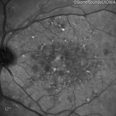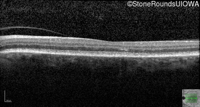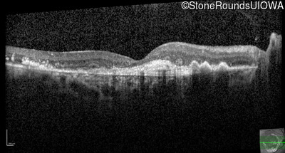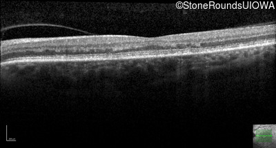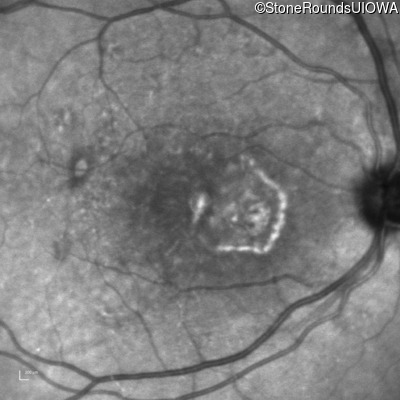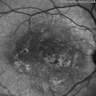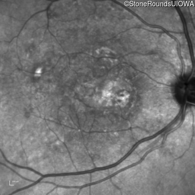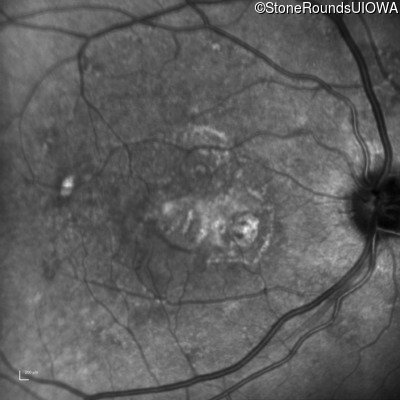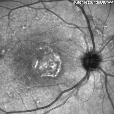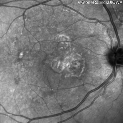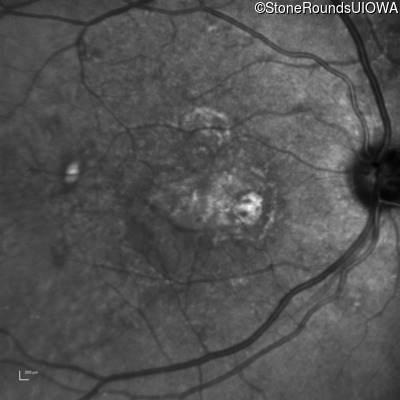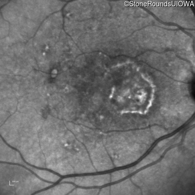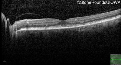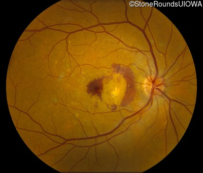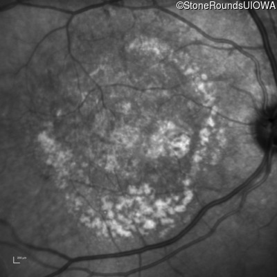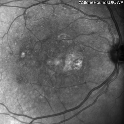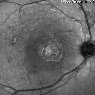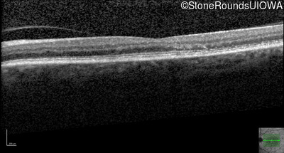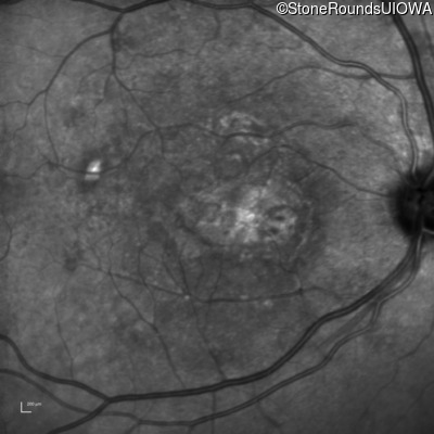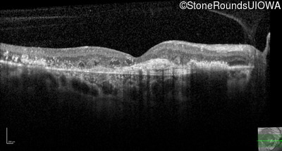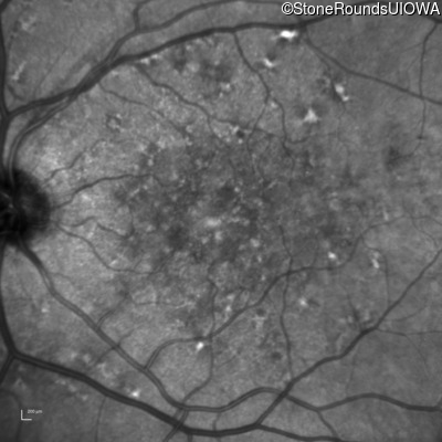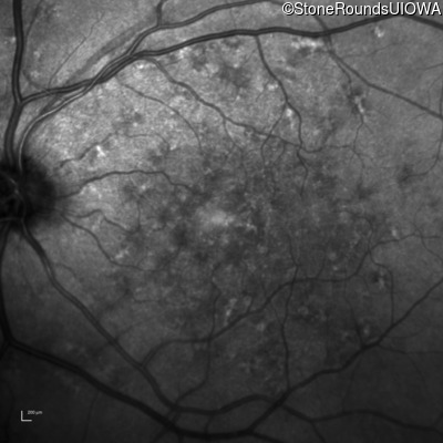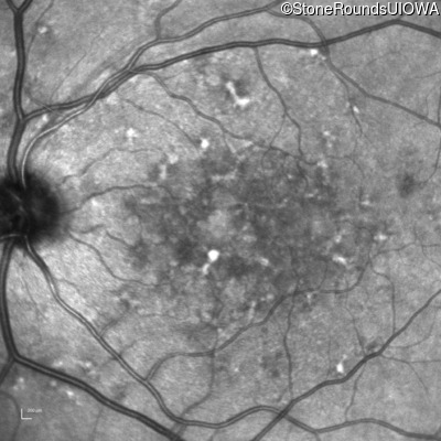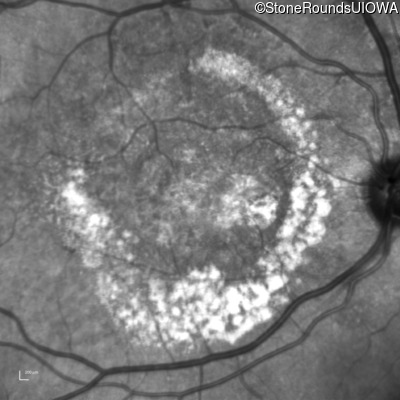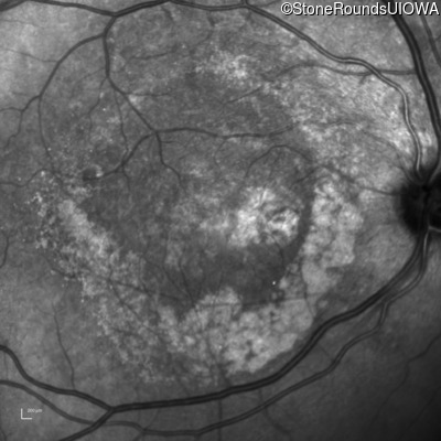 This 59 year old woman first noticed vision loss in her right eye a few months earlier. She has a cousin with Rhodopsin-associated RP.