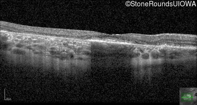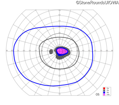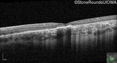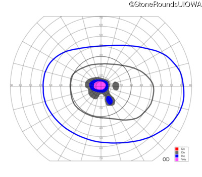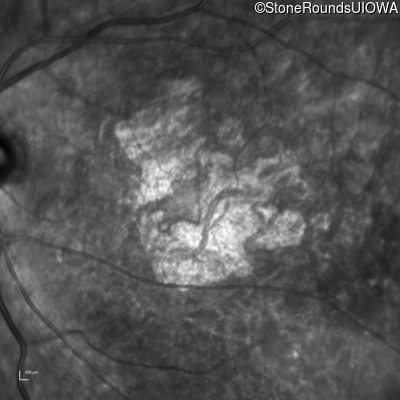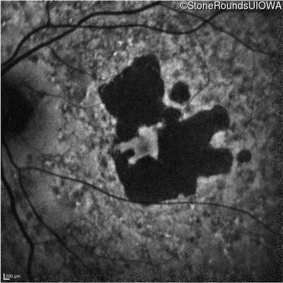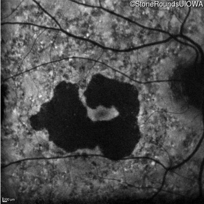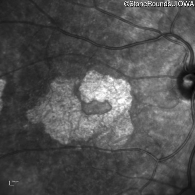 This 61 year old woman first noticed an abnormality in the center of her vision in dim light when she was 8 years old.