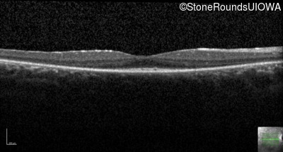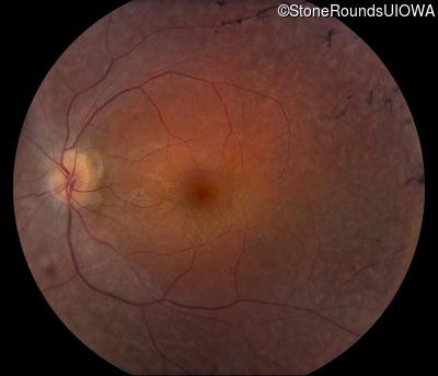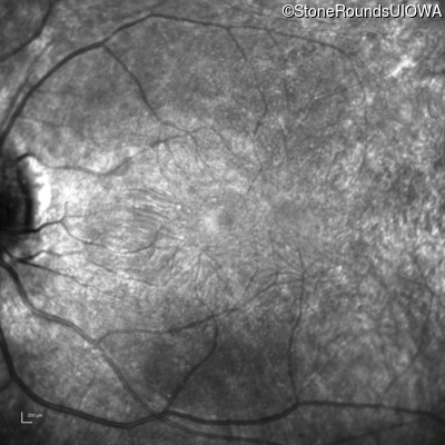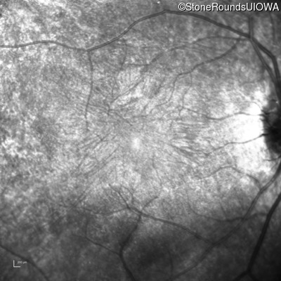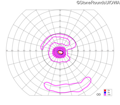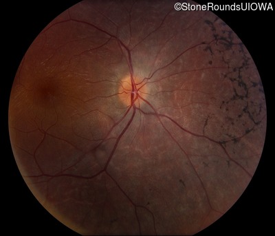This 24 year old woman first noticed difficulty tracking a volleyball when she was 15 years old. More recently she has been reluctant to go running because of her constricted visual field inferiorly. She did not have any nyctalopia when she was first symptomatic but has developed it more recently.