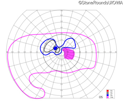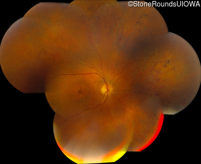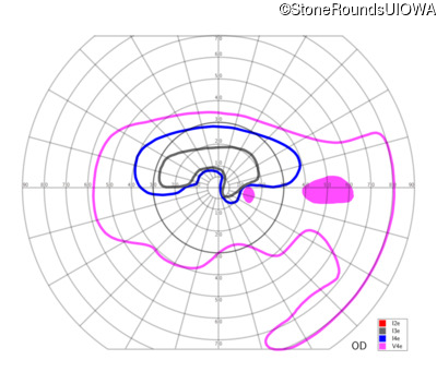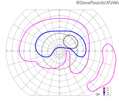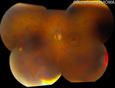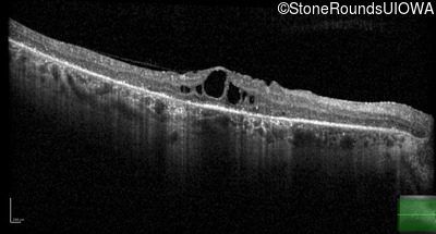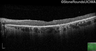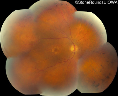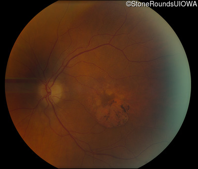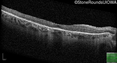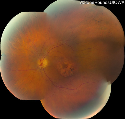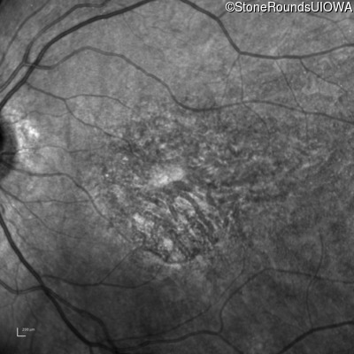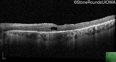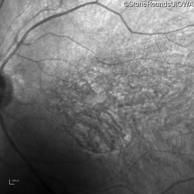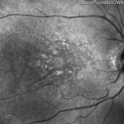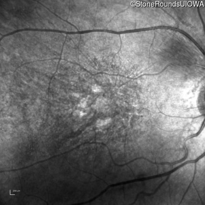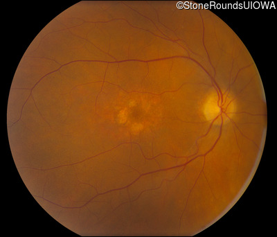 This 60 year old woman first noticed difficulty reading the newspaper about 1 year ago. She also noticed worsening photophobia about that time.