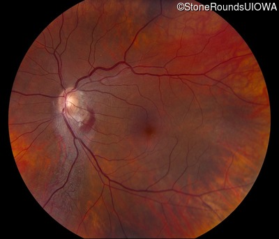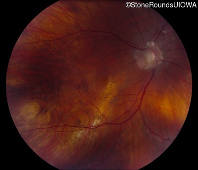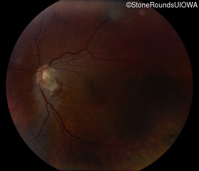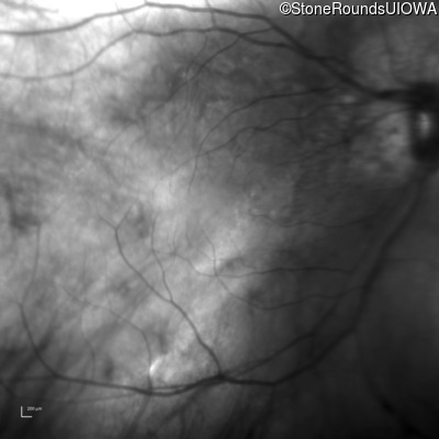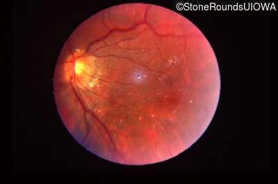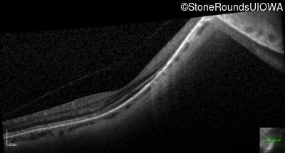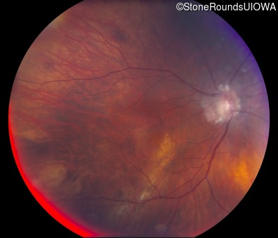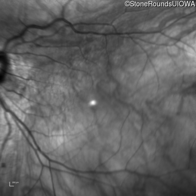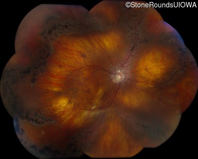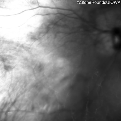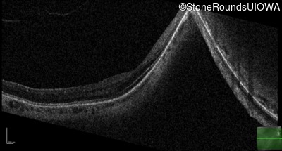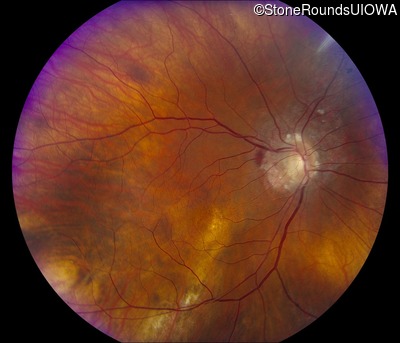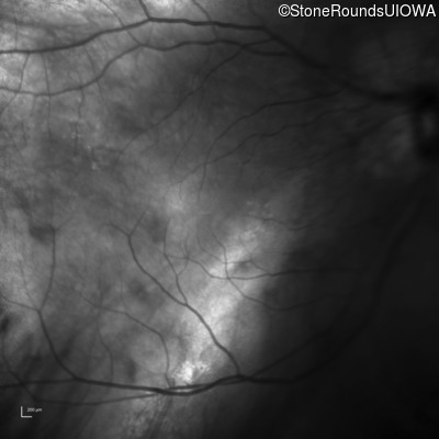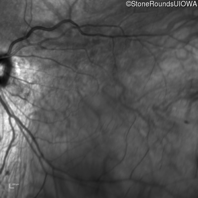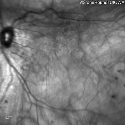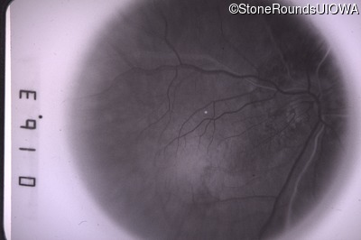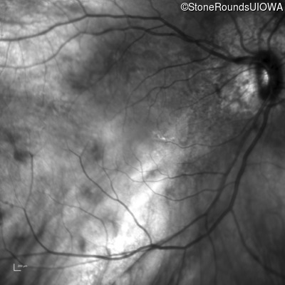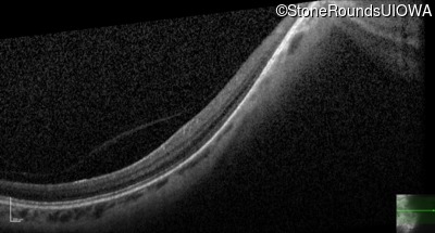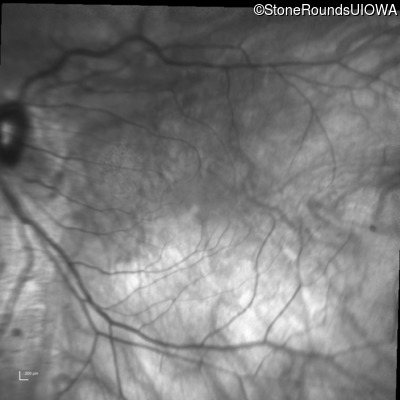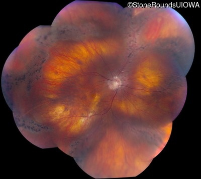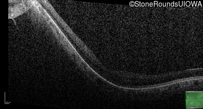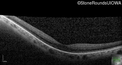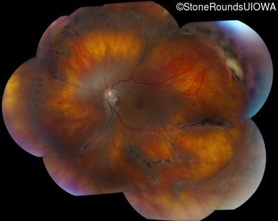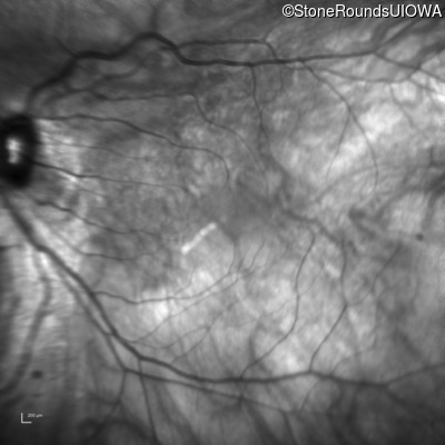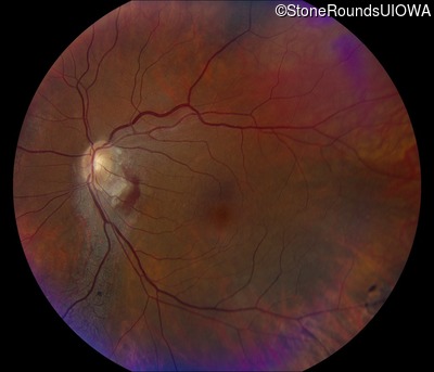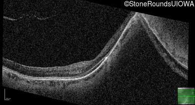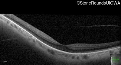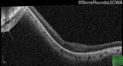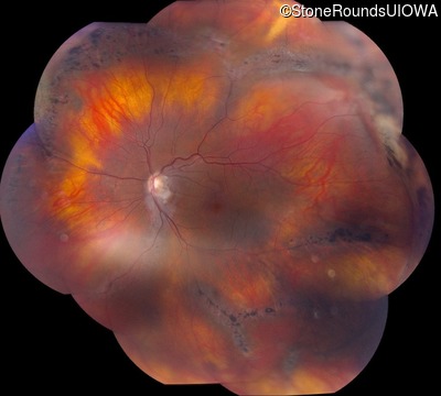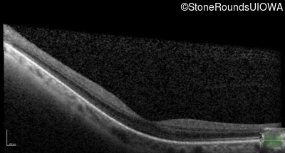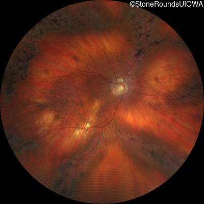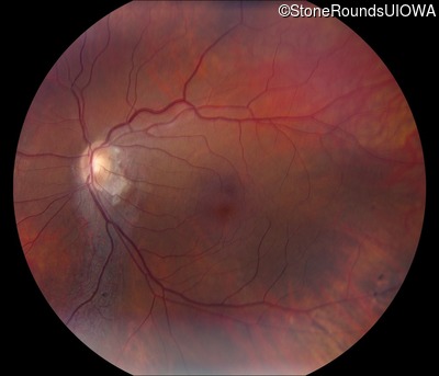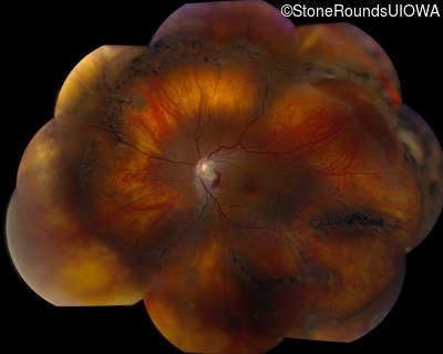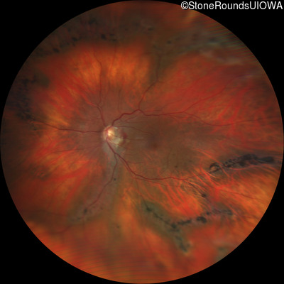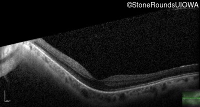 This 41 year old woman was highly myopic as a child and experienced a rhegmatogenous retinal detachment OS at age 20.
