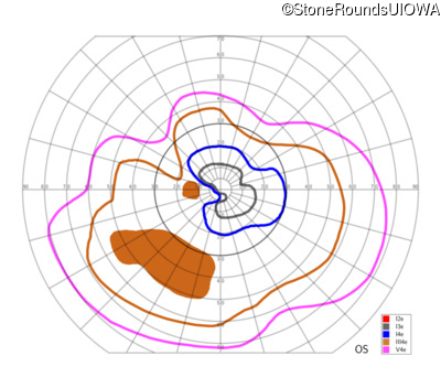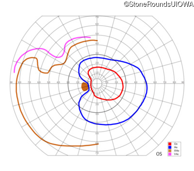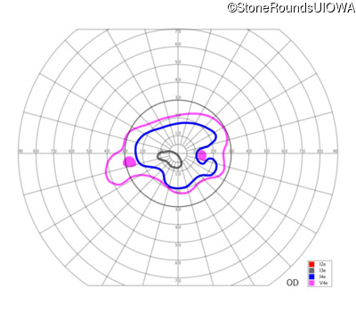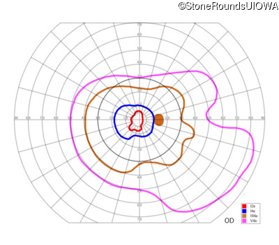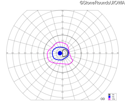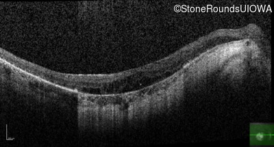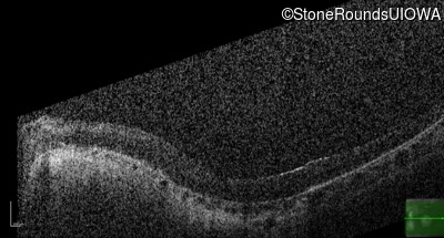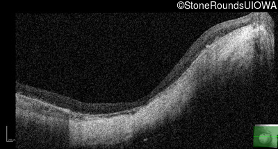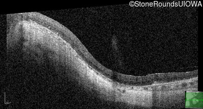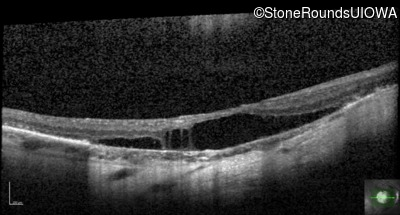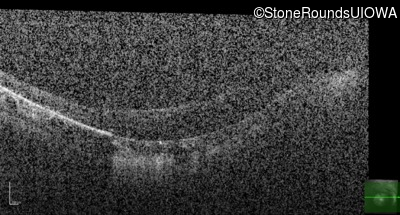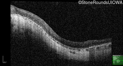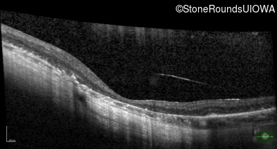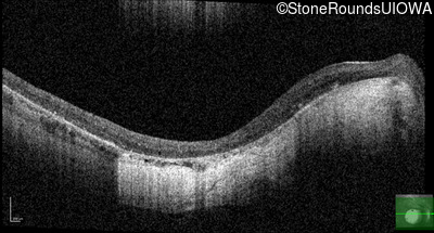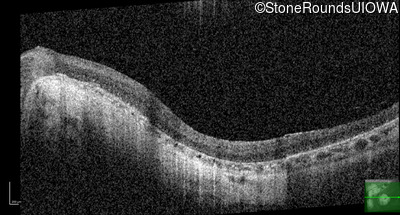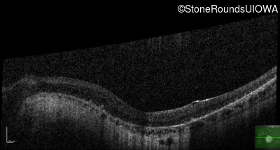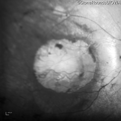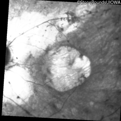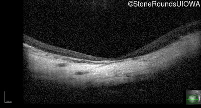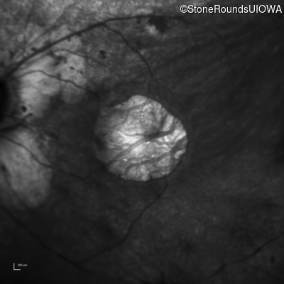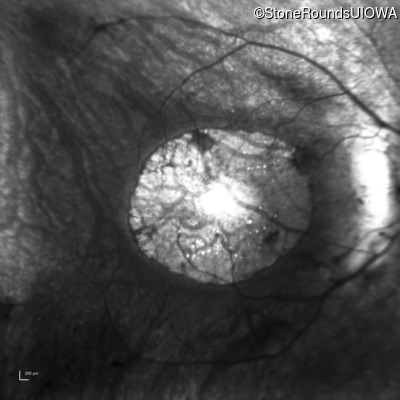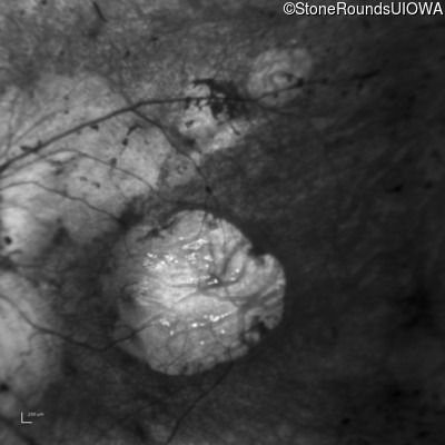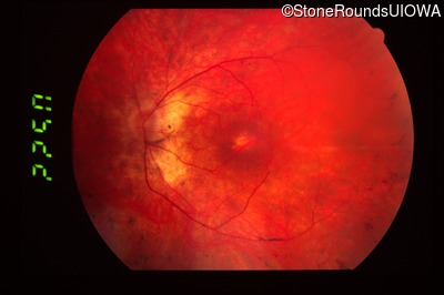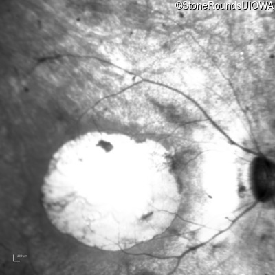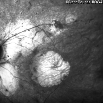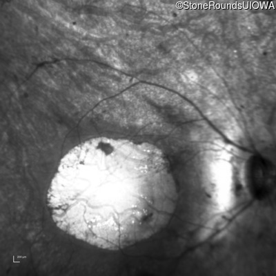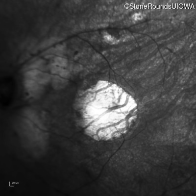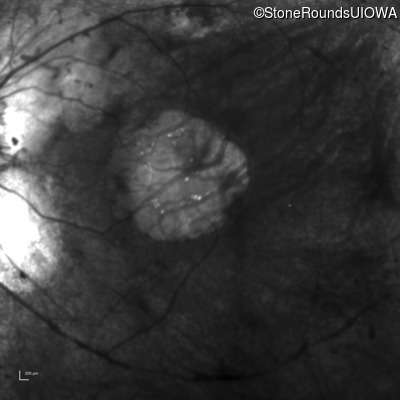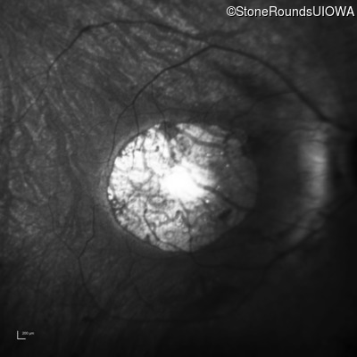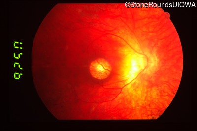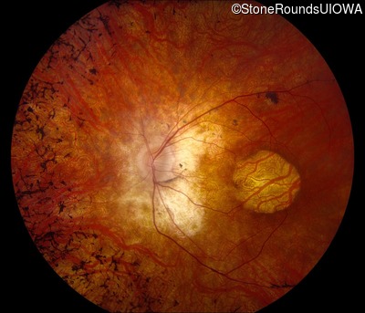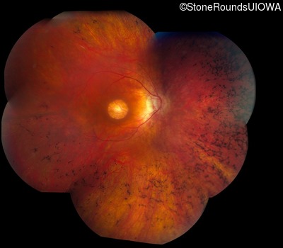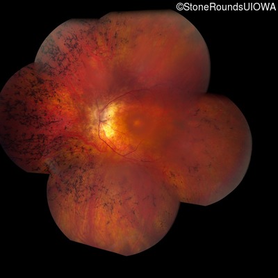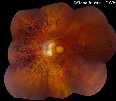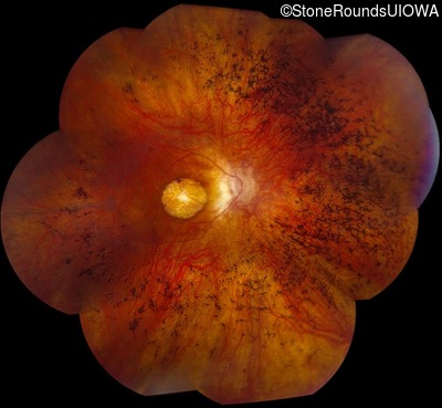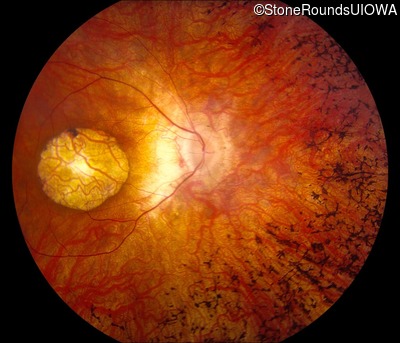 This 15 year old male had a macular abnormality noted two weeks ago when he was refracted for his first pair of glasses. Bone spicule-like pigmentation was first noticed a year later (age 16) during a routine follow-up eye exam.