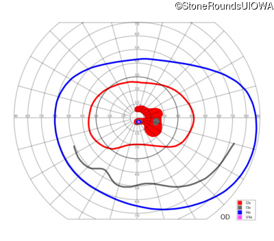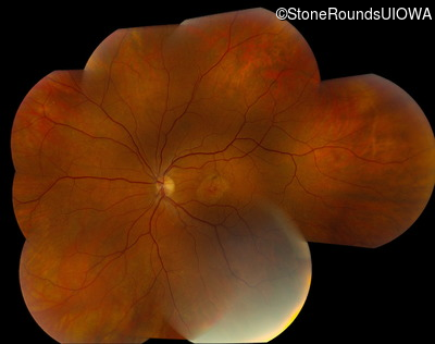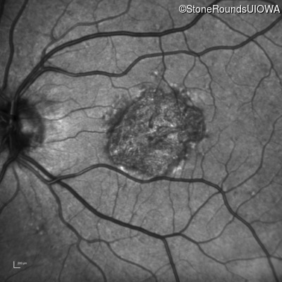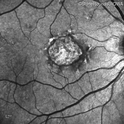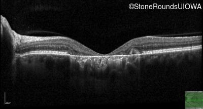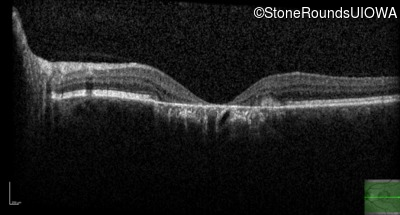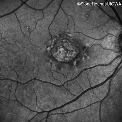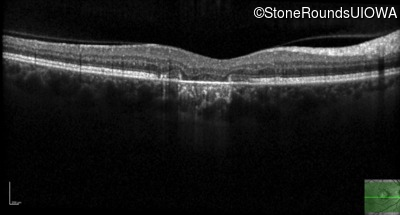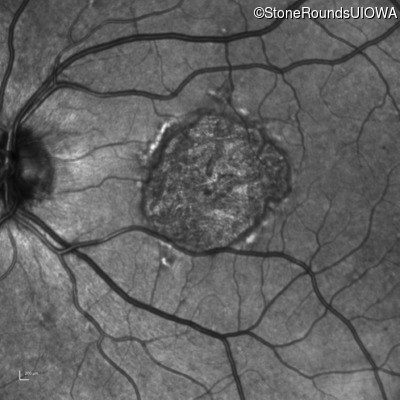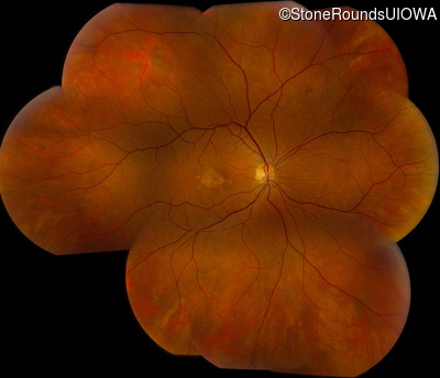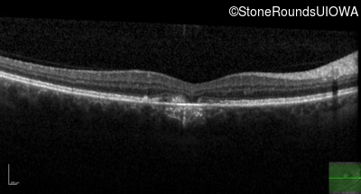 This 51 year old woman first noticed some metamorphopsia in her left eye in her early 30's.