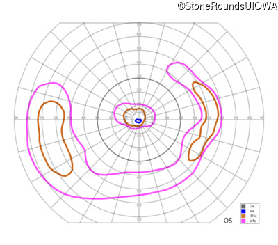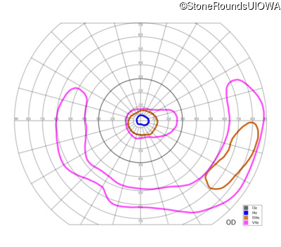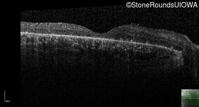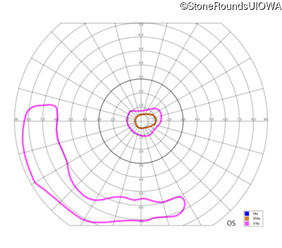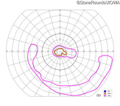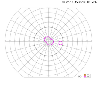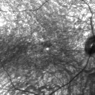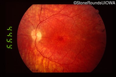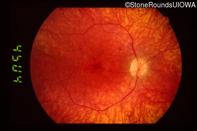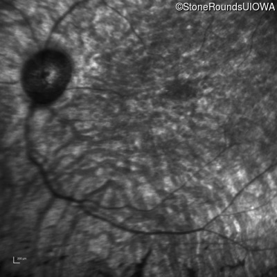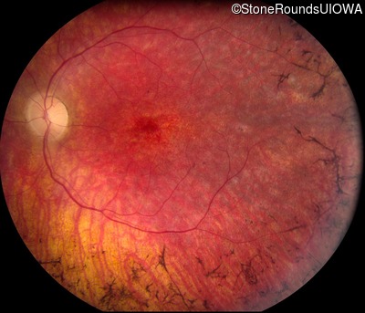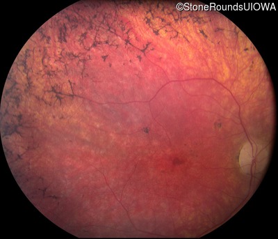 This 25 year old woman has had reduced acuity since age 6 (20/60 OD & 20/100 OS). She had abnormal pigmentation noted in her retina at that time. She had postaxial polydactyl of the left hand and right foot.