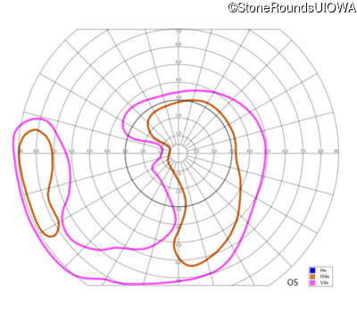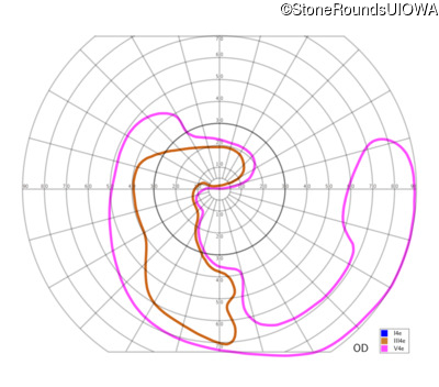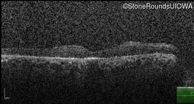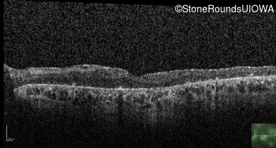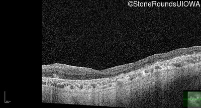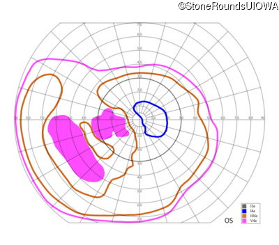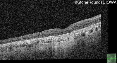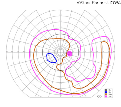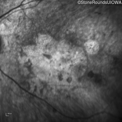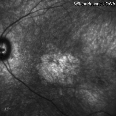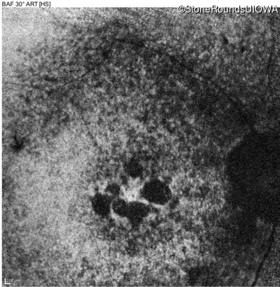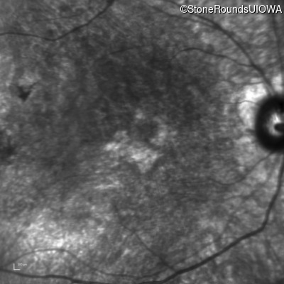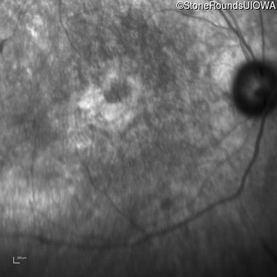 This 30 year old woman first experienced a reduction of visual acuity at age 20. She had no difficulties in dim light at that time. Over the next 10 years her central vision continued to worsen and she developed some difficulty seeing in dim light.