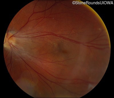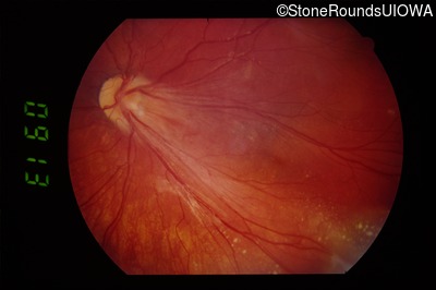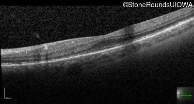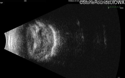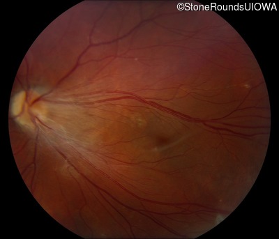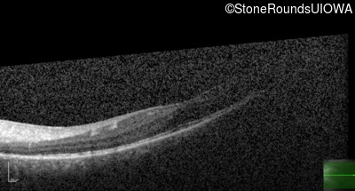 This 16 year old male had an untreatable retinal detachment discovered in his right eye at age 3. A year later he developed a retinal detachment in his left eye which was successfully repaired with a combination vitrectomy and scleral buckle. The visual acuity gradually improved to 20/30 following surgery.