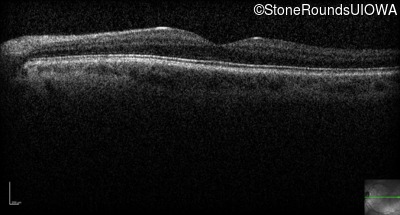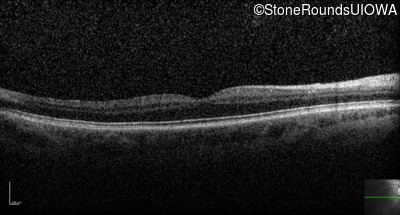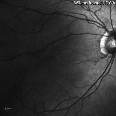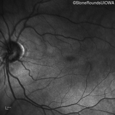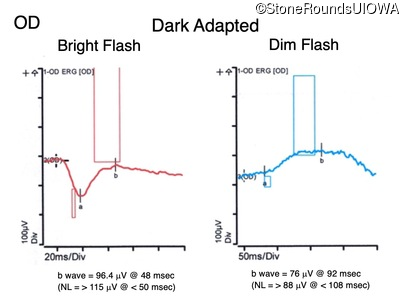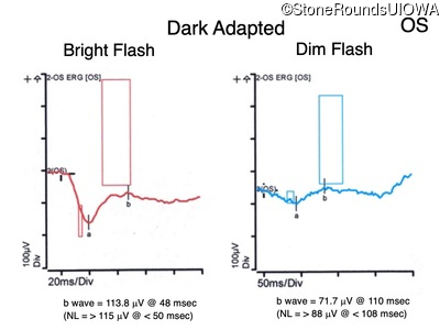 The clinical features supporting the diagnosis of congenital stationary synaptic dysfunction in this patient include: nystagmus noticed in the first year of life; reduced acuity; normal color naming; a normal fundus appearance; a normal OCT; selective loss of the b-wave on the scotopic bright flash ERG; normally sighted parents; and, a similarly affected maternal grandfather and maternal male cousin.