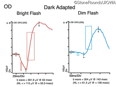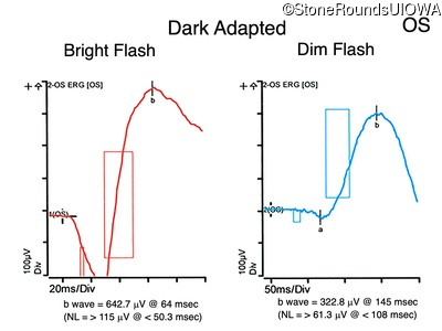 This 42 year old woman had nystagmus noticed by her parents in the first year of life. She sees best at twilight and is uncomfortable in brighter light.