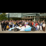 • Buddy Lazier (seated in his 2014 Iowa Vision Research Indy car) poses with many of the IVR faculty and staff before serving as the Grand Marshall of the 2014 University of Iowa homecoming parade in downtown Iowa City.