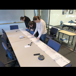 • Scott Whitmore (left) Adam DeLuca (center) and Jean Andorf (right) examine the pedigree of one of the larger families studied by the Molecular Ophthalmology Laboratory (2018).