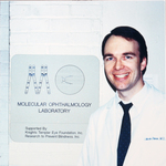 In July of 1986, Ed Stone and his wife Mary, a dermatologist, came to Iowa City for Ed's ophthalmology residency and Mary's first faculty position. Ed was attracted to Iowa for many reasons, one of which was Stan Thompson and Jim Corbett saying, "you should come here!" when his resident applicant tour group poked their heads into neuro-ophth morning rounds during their tour. Another was Iowa's famous faculty that at the time included (in addition to Thompson and Corbett), Fred Blodi, Bob Watzke, Sohan Hayreh, Bill Scott, Joerg Kolder, Tom Weingeist, Jim Folk, Rick Anderson, David Tse, Frank Judisch, Jay Krachmer, Chuck Phelps and Karl Ossoinig. But, perhaps most important was the interest that the residency selection committee expressed in Ed's desire to use his graduate training in molecular biology to study inherited diseases of the eye. Tom Weingeist was a member of that selection committee and encouraged Ed to set up a molecular biology lab shortly after his arrival. In fact, Tom decommissioned the electron microscope that he had used years earlier for his PhD work in the department and gave Ed access to that space (Med Labs room 361) in the beginning of 1987. The sign that Ed proudly placed outside that room at the time is to his knowledge the first use of the term "Molecular Ophthalmology."