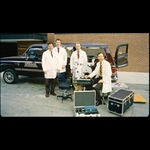 • Loading the truck for an early MOL road trip (1987). Left to right: Tom Weingeist, Ed Stone, Mark McCarthy and Ed Heffron. The 30 degree Zeiss fundus camera in the photograph was borrowed from the clinic for the weekend and returned to service Sunday night.