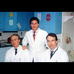 • In the 1980s, Iowa started three new ophthalmology residents every six months and the residency lasted 3.5 years. Pictured here are the July-December 1986 group, left to right: Mark McCarthy, Lee Birchansky and Ed Stone. The location is the 2 tower nursing station from which all the histories and physicals for the following day's surgeries for the entire department were performed by the new residents at the end of their regular work day.