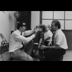 • Stone examines a young research subject during a road trip as the youngster's father and brother look on (1987).