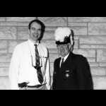 • Howard Walden, representing the Knights Templar Eye Foundation (left), congratulates Ed Stone (right) on the receipt of his first grant (1987).