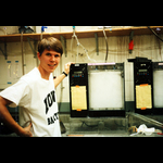 • Reid Longmuir stands in front of an automated silver staining device (gonculator) used to detect DNA in polyacrylamide gels (1990). The prototype of this device was built in Stone's basement and used cascaded resistor-capacitor timing circuits to trigger relay-controlled dishwasher valves.