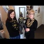 • Godzilla, the unofficial mascot of the CFCMD and later IVR in his hand-knitted Hawkeye scarf and mittens, flanked by Luan Streb (left) and Dianna Brack (right).