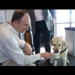 • Steve Kuusisto's guide dog Nira gets a drink from an HHMI mug (2010).