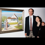 • Ed Stone and Mina Chung stand beside a painting by Lee Allen, a faculty member of our department for many years and a student of Grant Wood (2002).