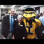 • Left to right: Ed Stone, UI President Sally Mason, and Herky the Hawk at an alumni meeting in Washington, D.C. (2011).