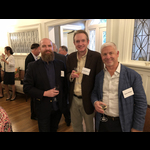 • Celebration of Budd Tucker's investiture as the Howard F. Ruby Chair of Human Retinal Engineering in UI President Bruce Harreld's home in Iowa City. Foreground, left to right: Budd Tucker, Rob Mullins, Brian Walker. Background, left to right: Mimi Carver, Gary Seamans, Marty Carver, Culver Boldt (2019).