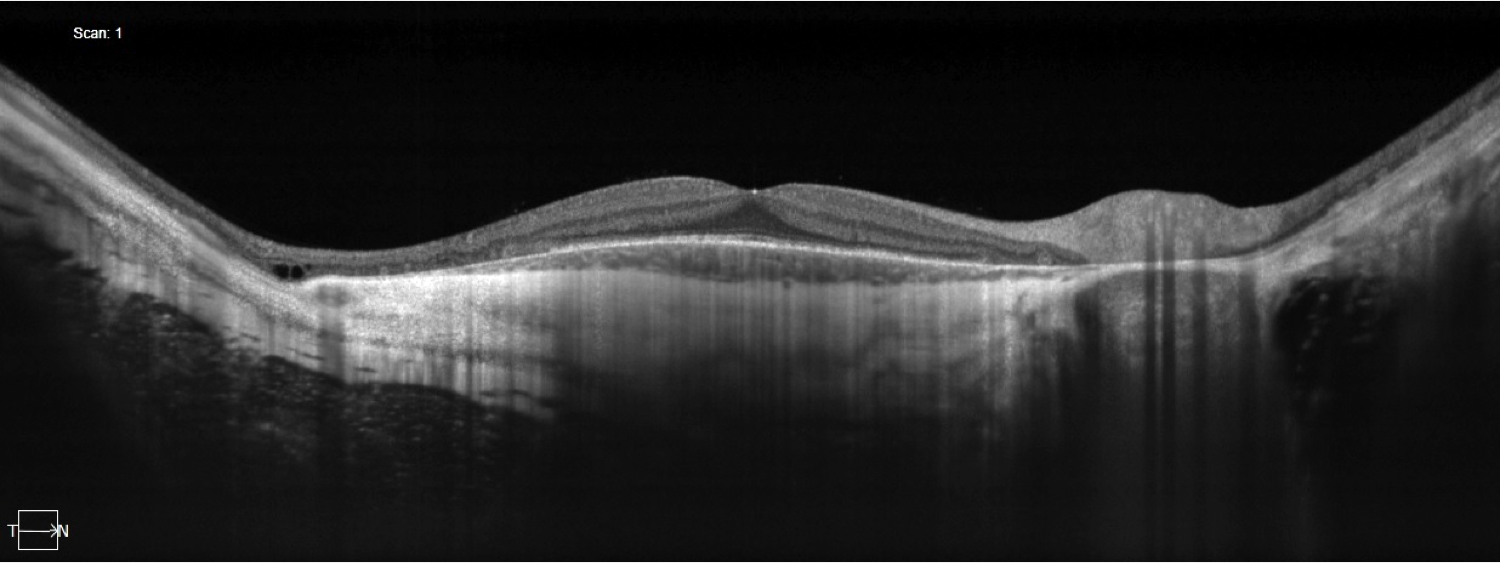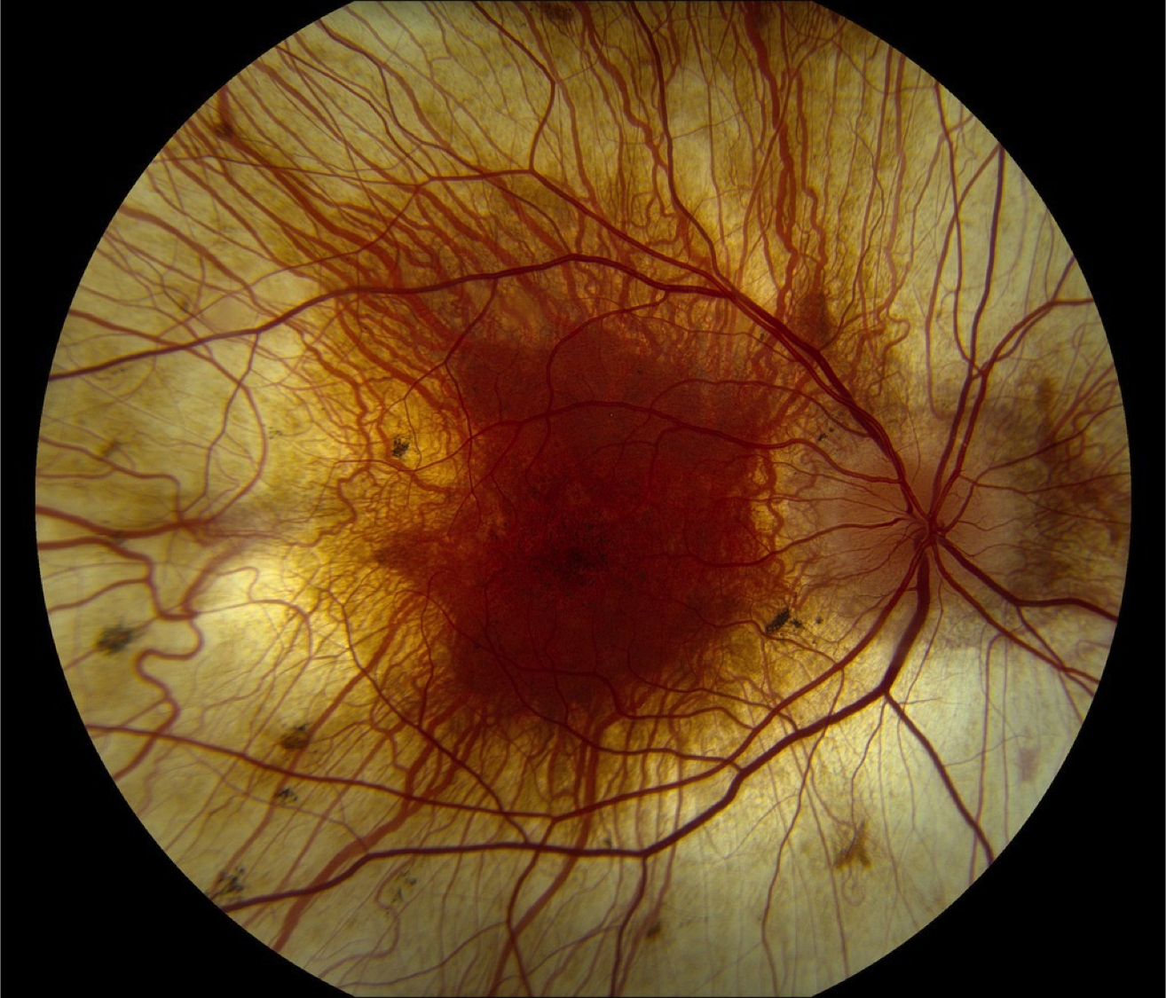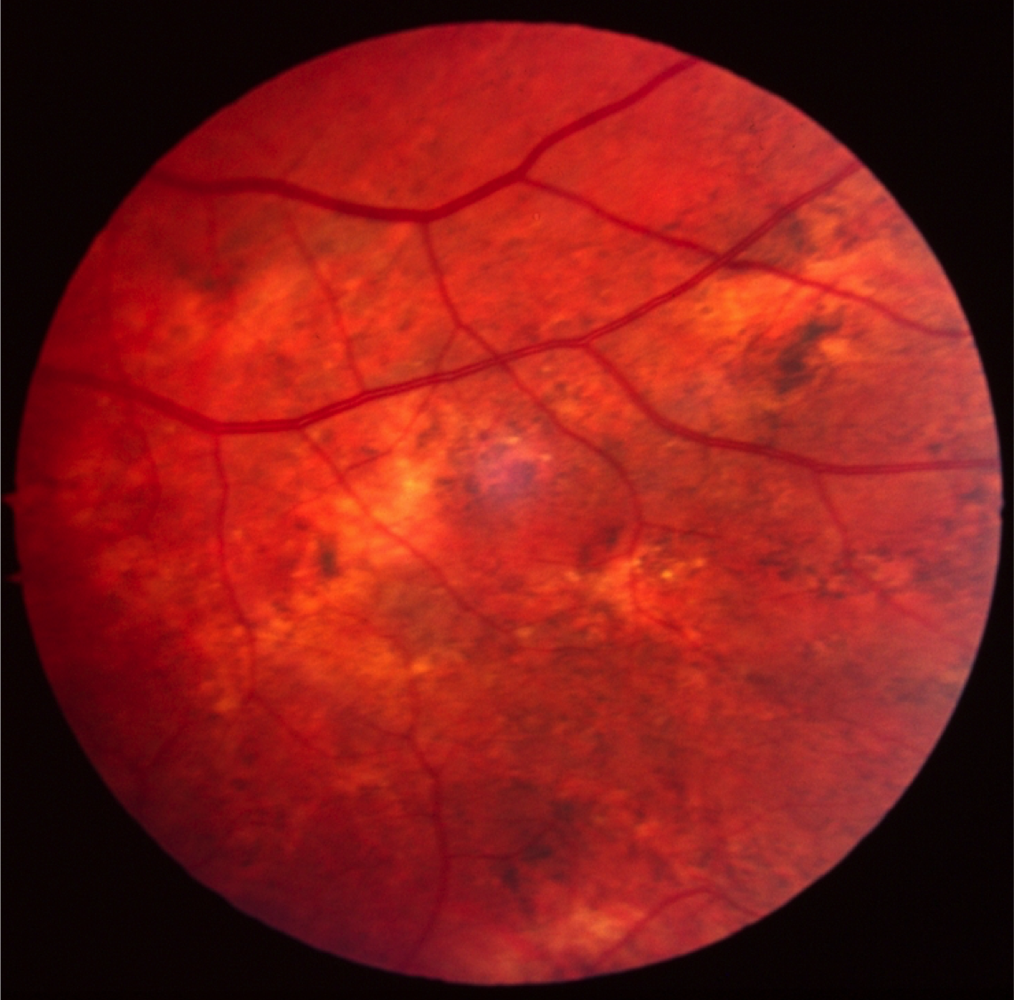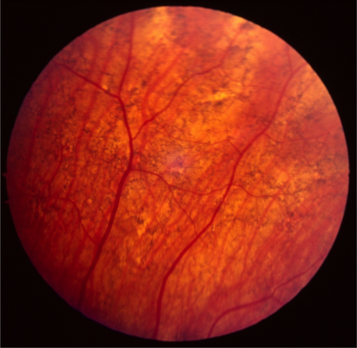 Case 1 is a 19 year old man with 20/20 acuity. He first came to medical attention at age 9 when nummular patches of choroidal atrophy were detected in the periphery of his fundus. His mother and maternal grandmother have completely normal vision but both of them have an unusual “mudspattered” appearance to their retinas.