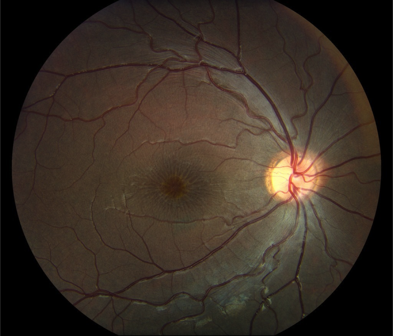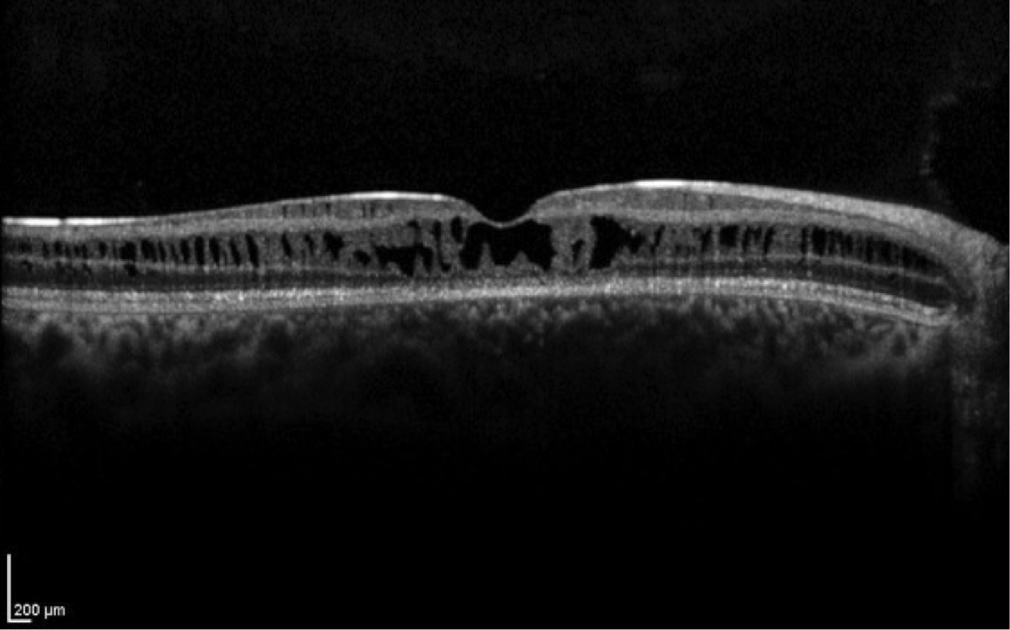 Case 14 is an 11 year old male with 20/60 vision. His parents have normal vision but he has a brother with reduced acuity. Fundus examination reveals normal disks and vessels, but there is a stellate arrangement of cysts centered on the fovea.