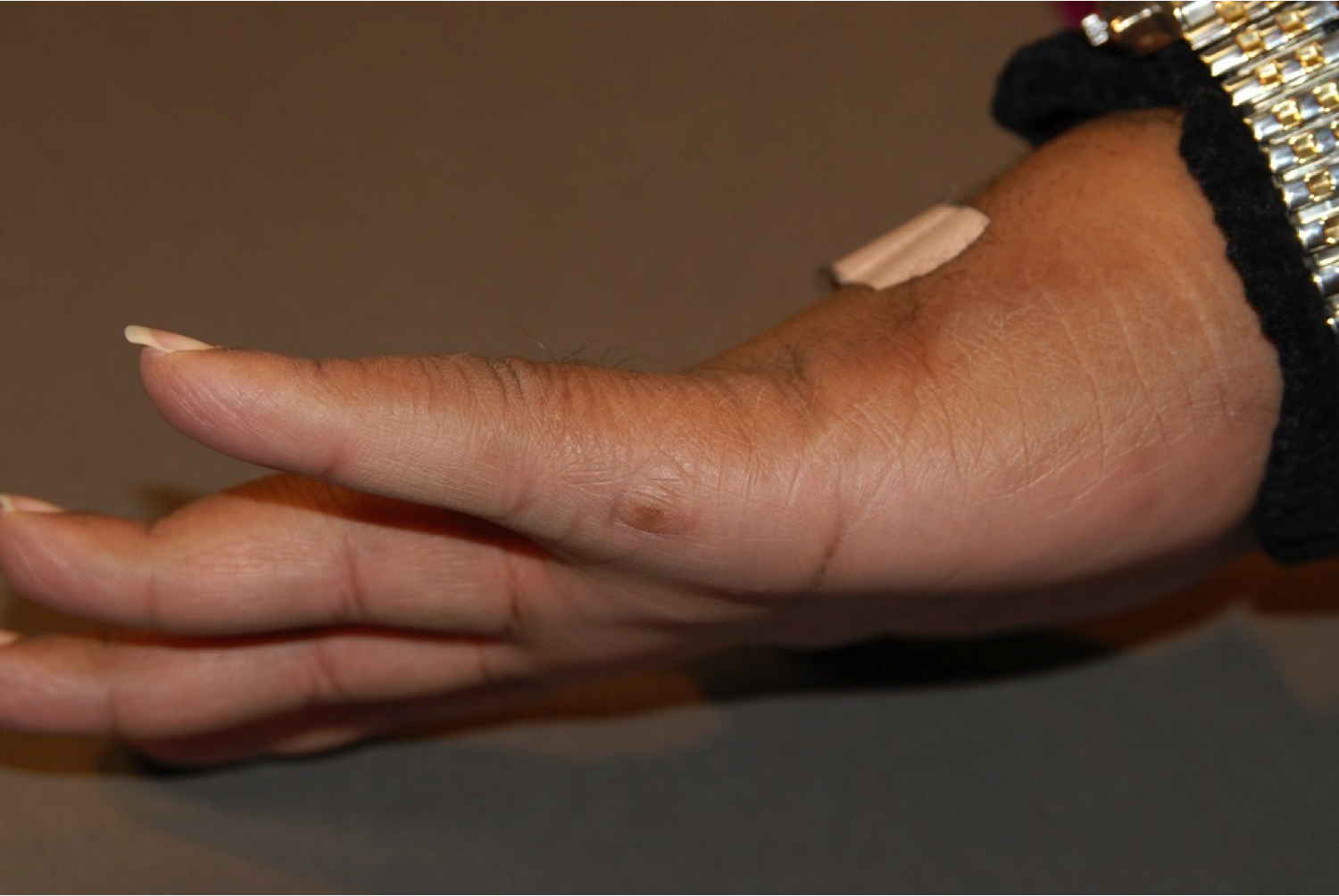 This lady was born with an extra digit on the postaxial side of both hands and both feet and small scars can still be seen where these digits were removed. Her cognitive ability is a bit below normal and her body mass index is above normal. She also has type 2 diabetes mellitus.